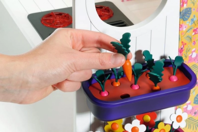 Hiška je opremljena s koriti in zelenjavnim vrtičkom za nabiranje sestavin za domišljijske večerje. Otroci lahko pripravljajo hrano na štedilniku in pogrnejo mizo za svoje punčke ter postrežejo solate in preste.