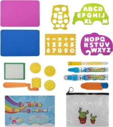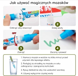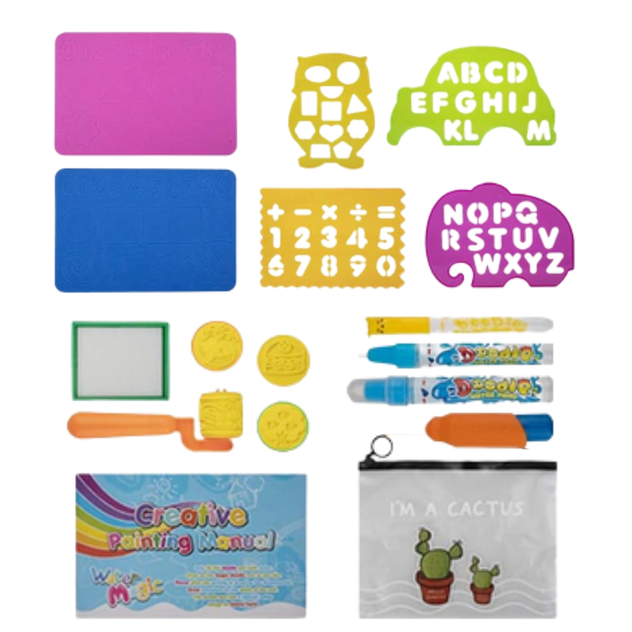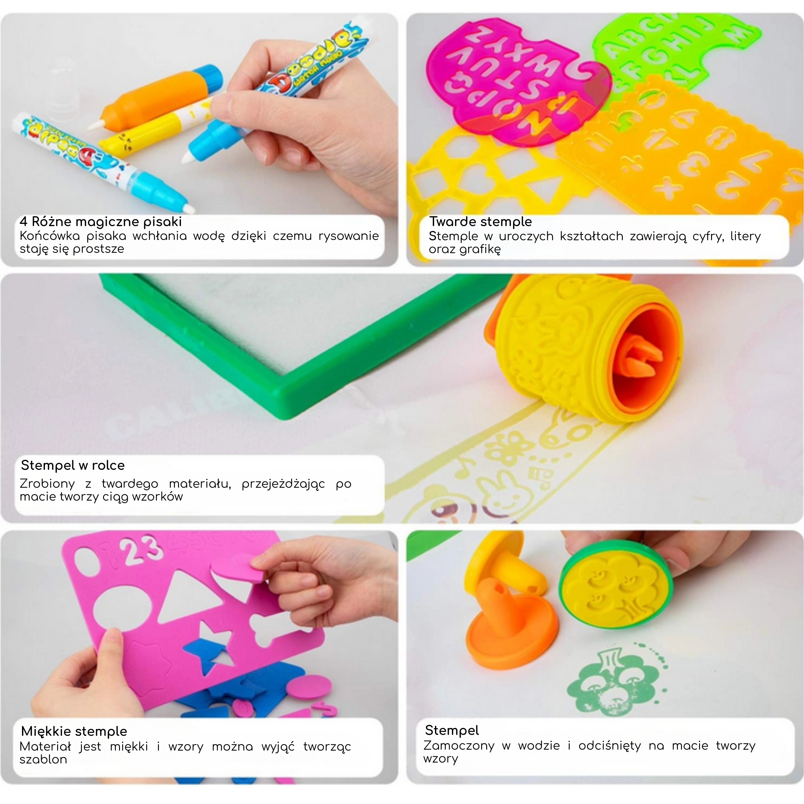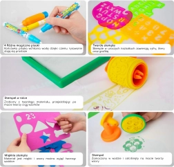 V paketu so 2 vodna flomastra, valjček z ročajem, 3 žigi in 2 izobraževalni šabloni, ki razširijo ustvarjalne možnosti. Podloga je lahka, enostavno zložljiva in izdelana iz varnih, nestrupenih in certificiranih materialov. Uporaba doma ali na vrtu spodbuja ustvarjalnost, koordinacijo oko–roka in jezikovne veščine – vse v obliki igre.