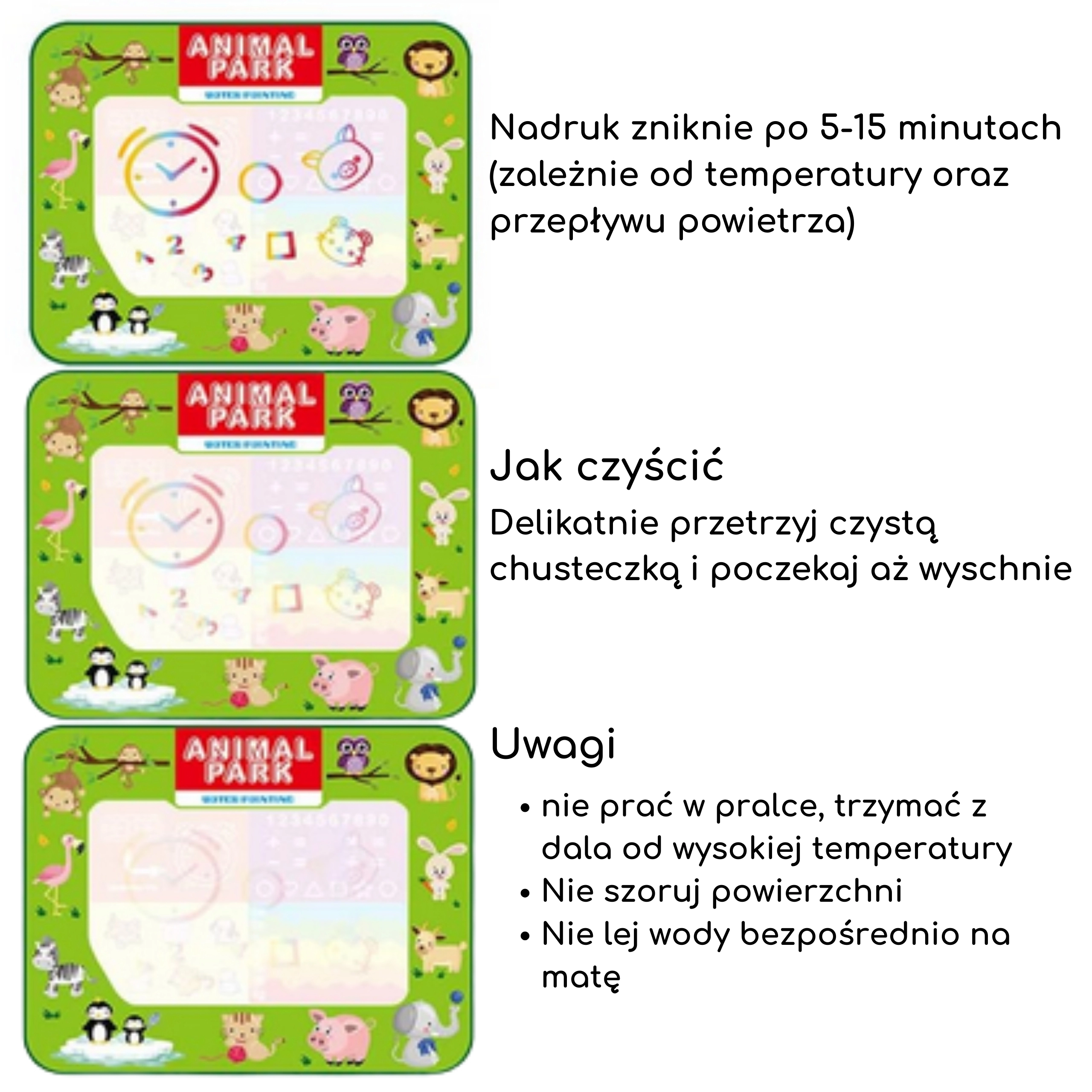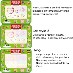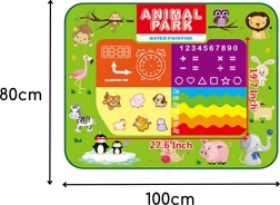 Vodna podloga Woopie Animal Park je idealna izbira za otroke od 3 let naprej. Zahvaljujoč posebni vodni tehnologiji se riše brez črnila in barv – le z vodo, zato brez madežev in umazanije. Dvostranski potisk ponuja bogato vsebino za učenje abecede, števil, oblik, živali ter osnov matematike in ur. Velika dimenzija 100 × 80 cm je odlična za samostojno ustvarjanje ali skupno igro s sorojenci.
