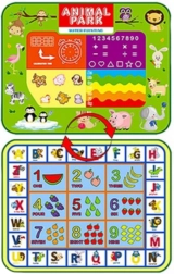 - Dvostranski izobraževalni dizajn: abeceda, številke, živali, naloge, ure in geometrijske oblike.
