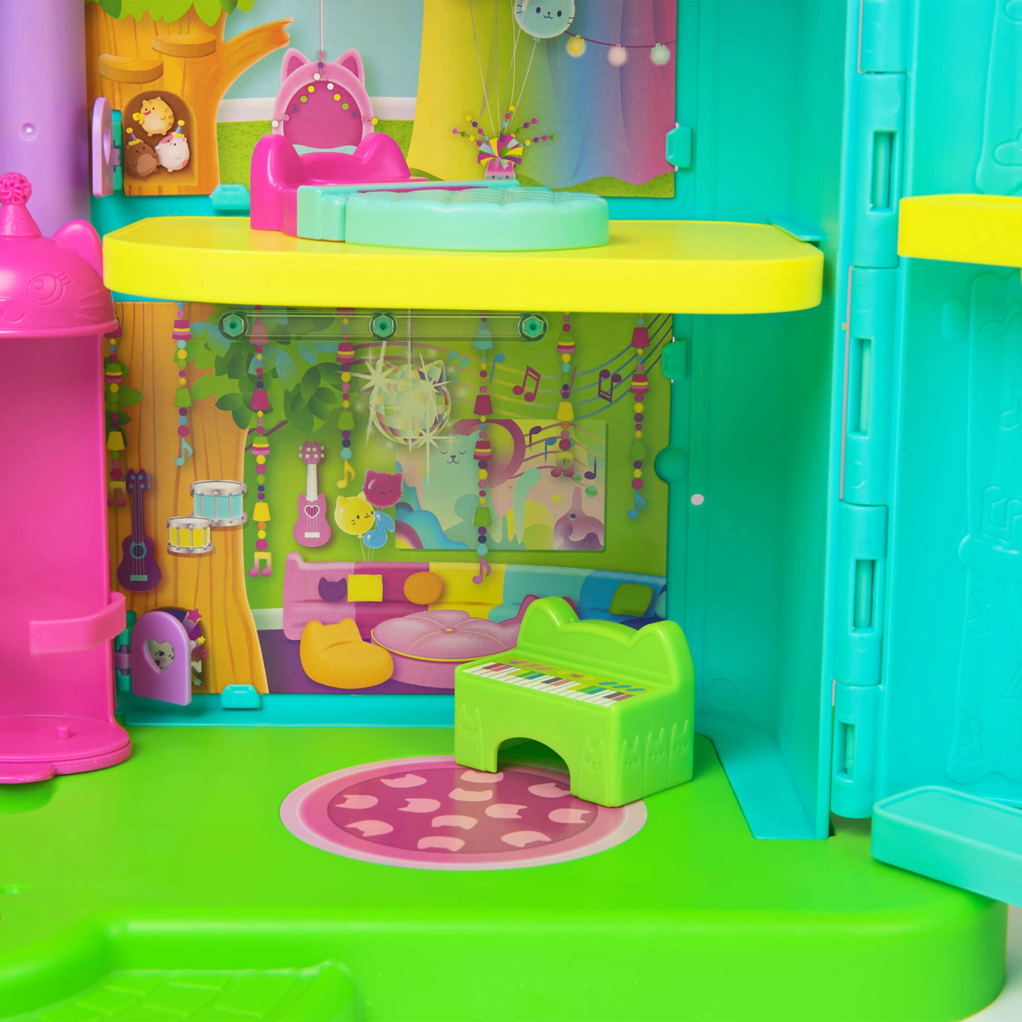 Po odprtju hišice in pritisku gumba se sproži do 6 znanih efektov in melodij, ki otroke popeljejo v svet Gabinega mačjega domka.