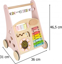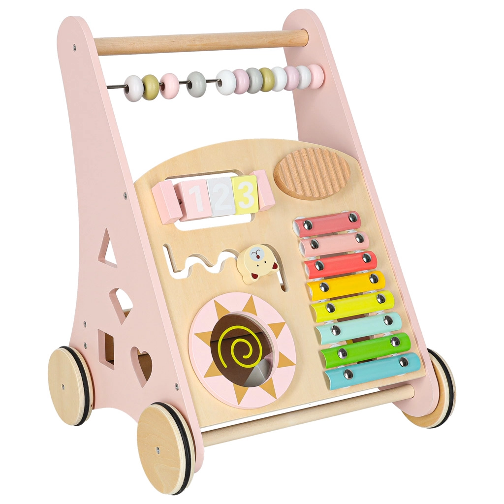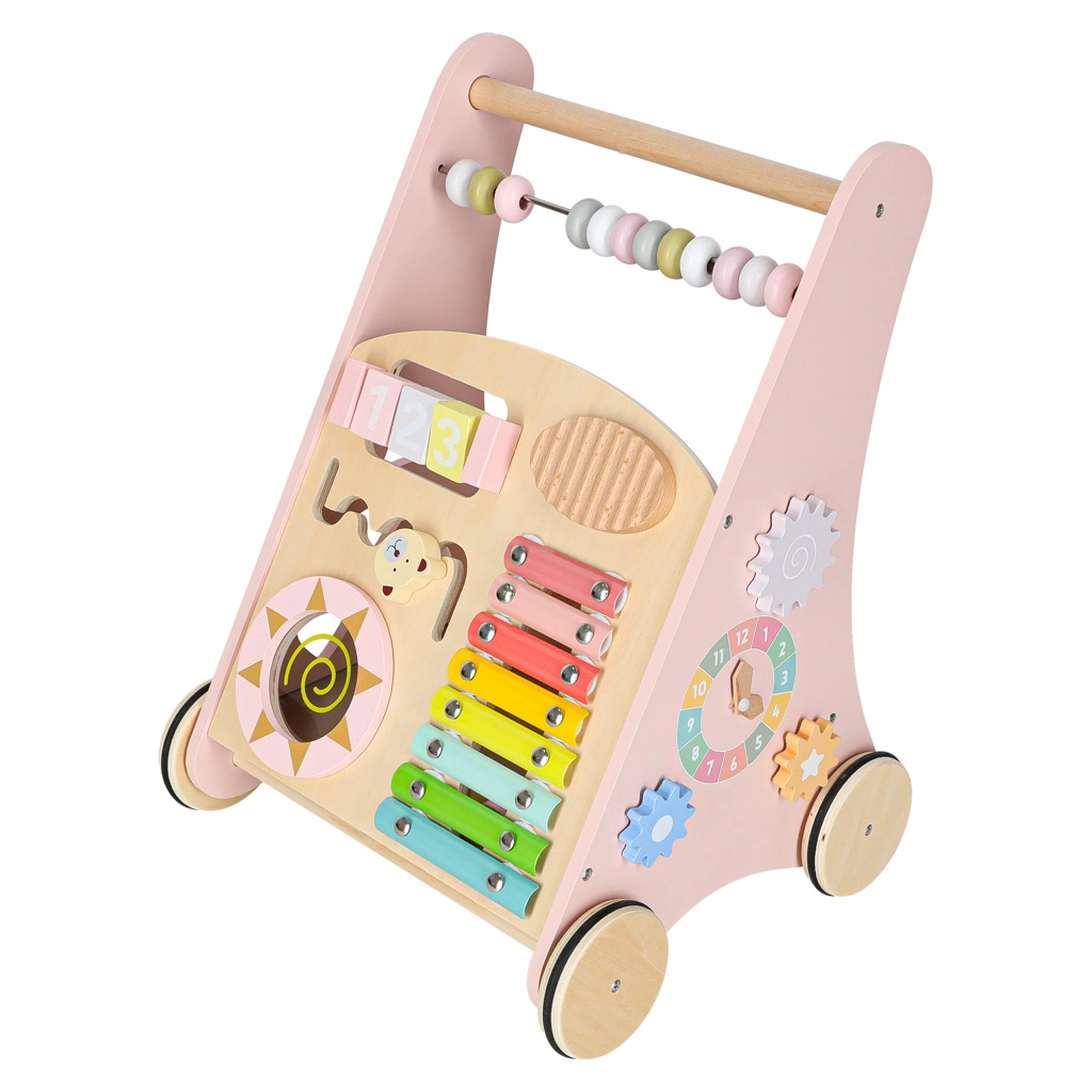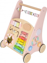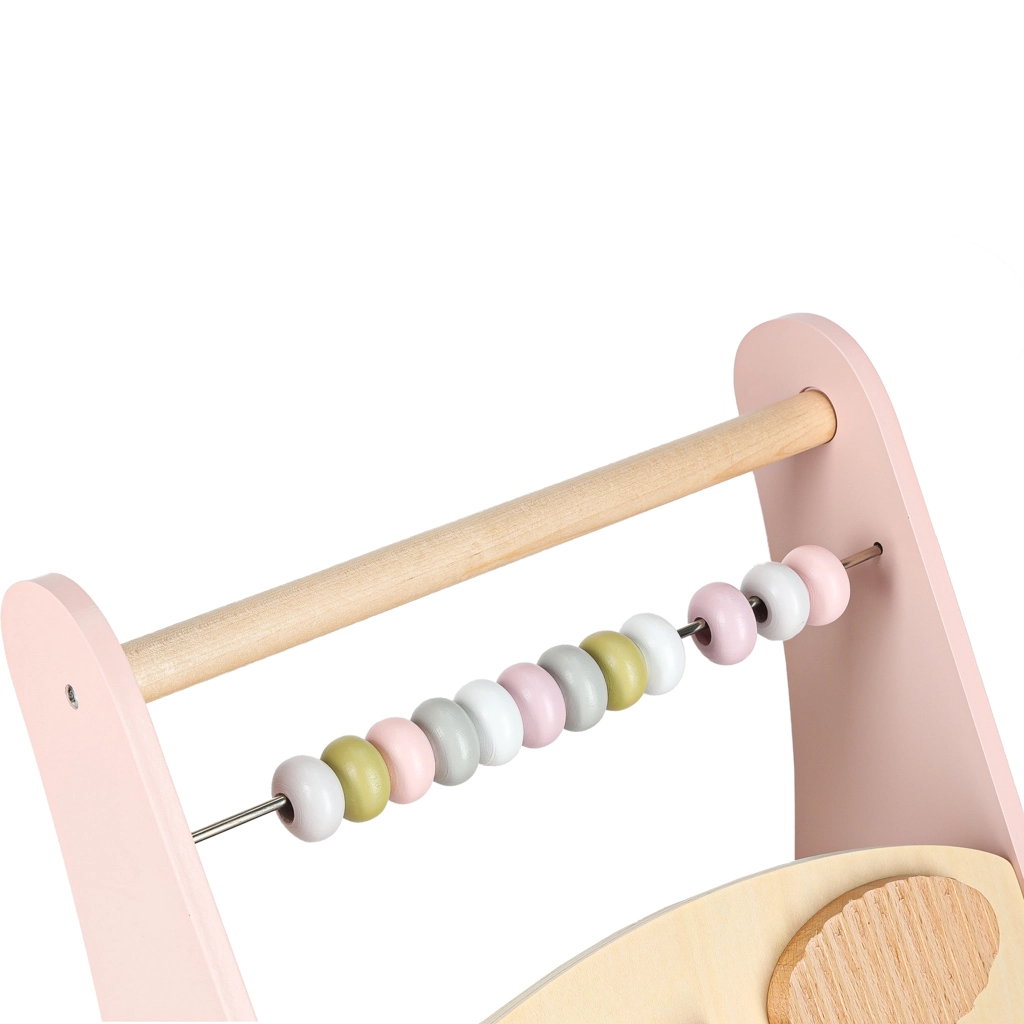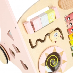 Ta stilni leseni hojnik v pastelno rožnati barvi podpira ravnotežje, koordinacijo in samozavest pri hoji. Sprednja plošča je opremljena s številnimi aktivnostmi: abako za prve račune, ksilofonom za odkrivanje zvokov, zobniki, vrtljivim diskom, razvrščanjem oblik in drsnimi elementi, ki razvijajo fino motoriko in osredotočenost.