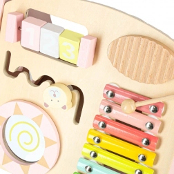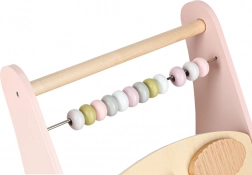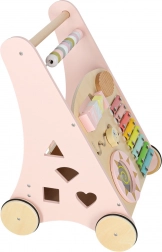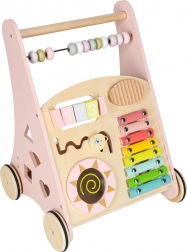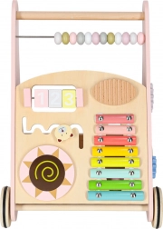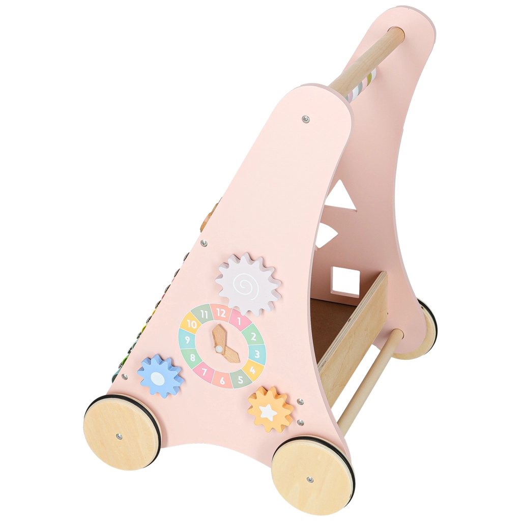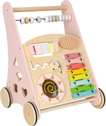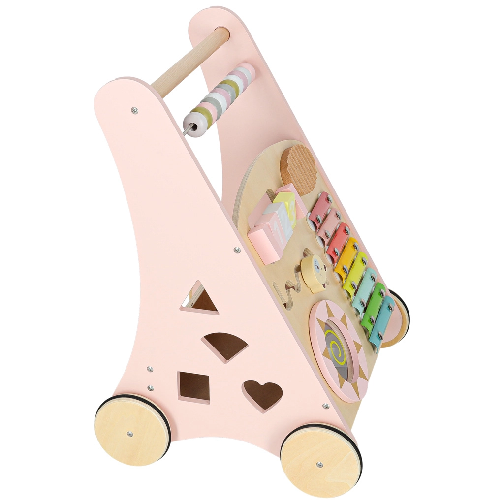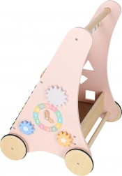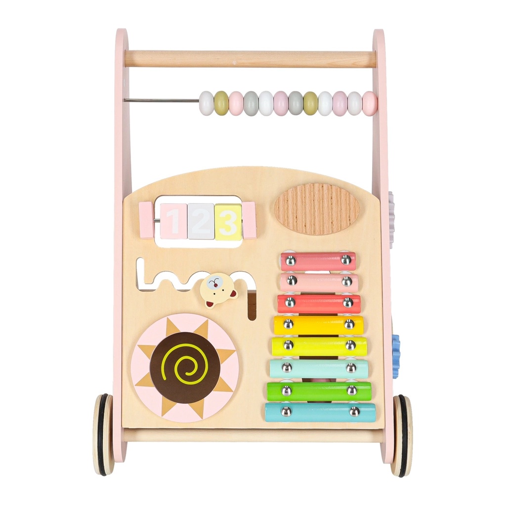 Ta stilni leseni hojnik v pastelno rožnati barvi podpira ravnotežje, koordinacijo in samozavest pri hoji. Sprednja plošča je opremljena s številnimi aktivnostmi: abako za prve račune, ksilofonom za odkrivanje zvokov, zobniki, vrtljivim diskom, razvrščanjem oblik in drsnimi elementi, ki razvijajo fino motoriko in osredotočenost.
