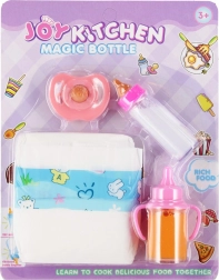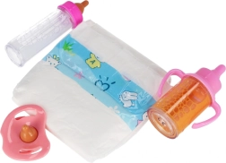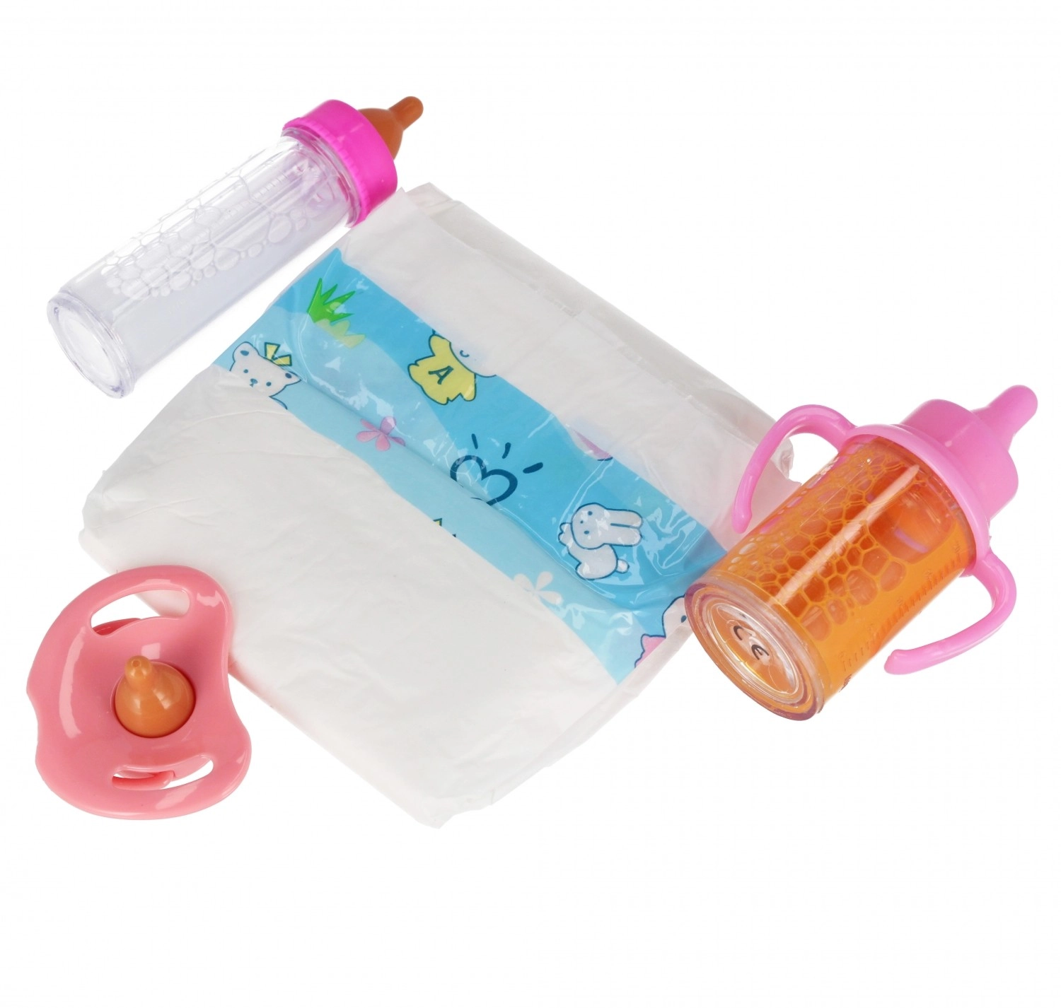 Otroški komplet dodatkov za dojenčkovo punčko prinaša vse potrebno za vsakodnevno nego – stekleničke, plenico in dudico. Spodbuja empatijo, skrbstvene veščine in domišljijo otrok. Primerno za otroke od 3 let. Cena za 1 kos.