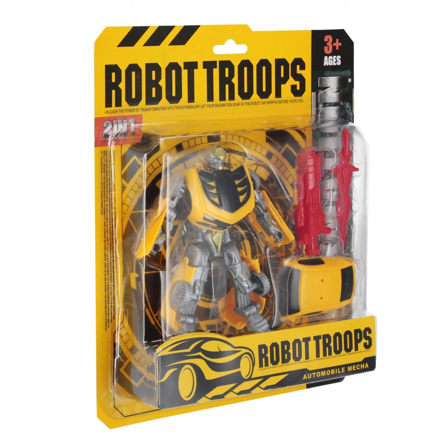 Zabaven in trpežen transformirajoči robot, ki se z enim gibom spremeni v avto. Zahvaljujoč priloženim dodatkom si lahko otroci ustvarjajo akcijske prizore in napete pustolovščine. Igrača zagotavlja varno uporabo in je primerna za otroke od 3 let. Cena je navedena za 1 kos.