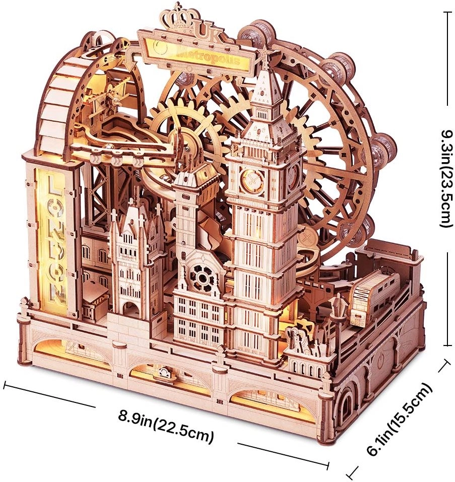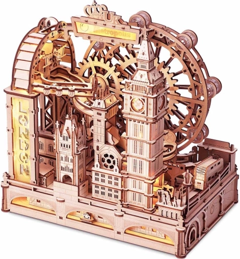 Odkrijte ikonične londonske znamenitosti v obliki elegantne 3D lesene sestavljanke. Model združuje Big Ben, Tower Bridge in London Eye z dinamično kroglično progo, kjer kovinske kroglice švigajo po klancih in tunelih zaradi gravitacije in zmogljivega motorja. Ne manjka niti simbolični kronanjski dragulji – vse z poudarkom na natančni izdelavi.