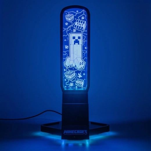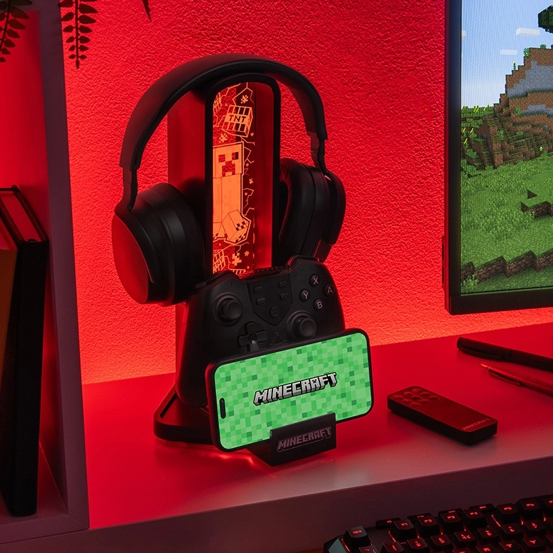Stilsko stojalo za slušalke, navdihnjeno s svetom Minecraft, navduši z višino 30 cm, večbarvnimi svetlobnimi načini, praktičnim držalom za telefon in parom USB‑C priključkov za polnjenje dodatne opreme. Upravljanje je udobno zahvaljujoč daljinskemu upravljalniku in napajanju prek USB kabla, ki je priložen v paketu.