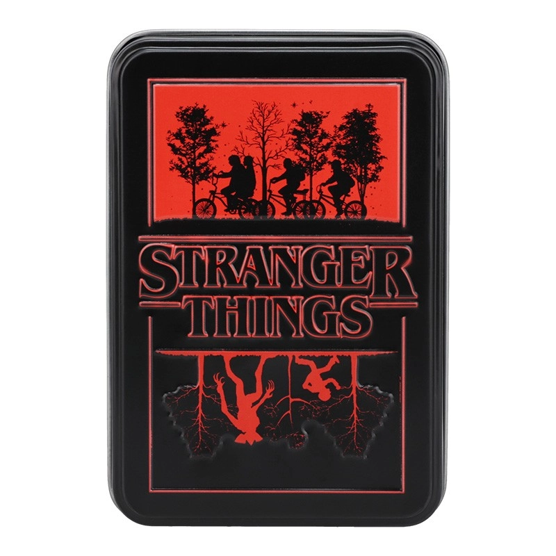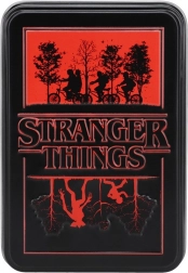 Oboževalci serije Stranger Things bodo uživali v klasični kartni zabavi s tematskim pakiranjem v pločevinasti škatlici. Komplet vsebuje 54 žolnerskih kart, idealnih za potovanja, zabave in zbirateljske vitrinske postavitve.