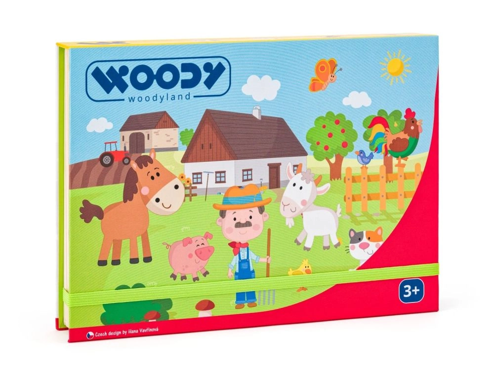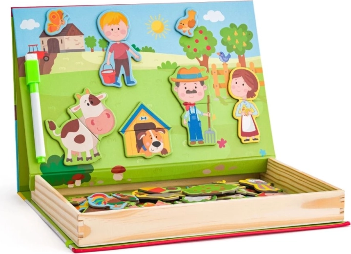 Ta magnetni set s kmečko tematiko prinaša otrokom ure ustvarjalne zabave. Odprta lesena škatla služi kot magnetna tabla, na katero je mogoče pritrditi barvite dele z liki, živalmi in dodatki. Otroci sestavljajo svoje zgodbe, spoznavajo živali in vadijo koordinacijo oko–roka.
