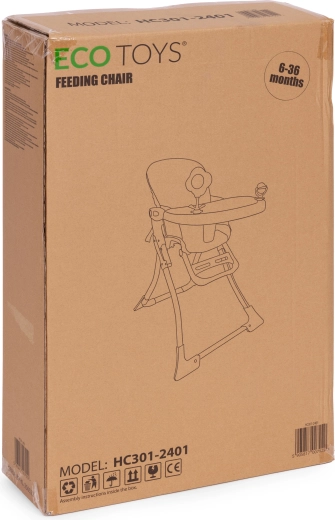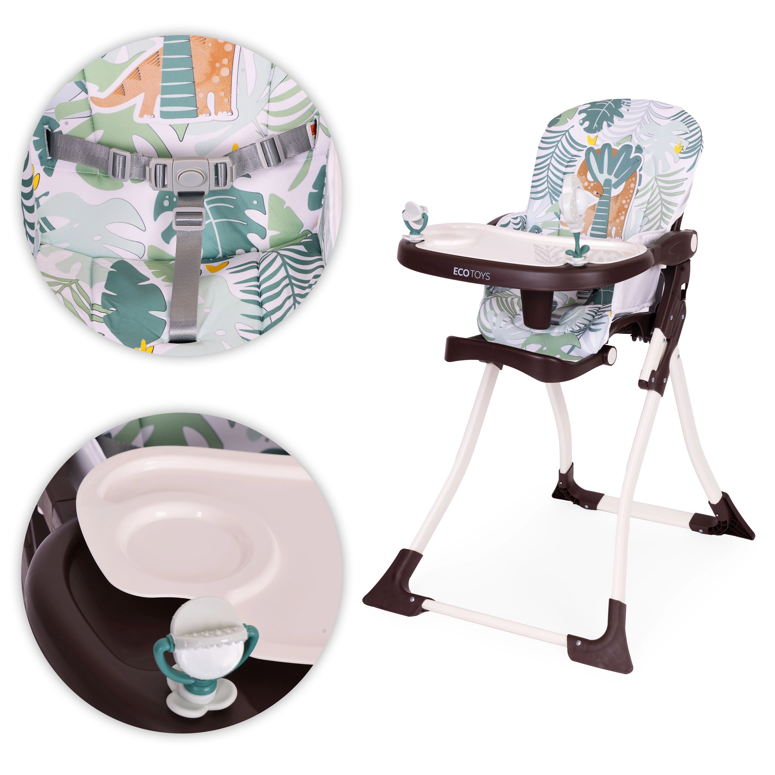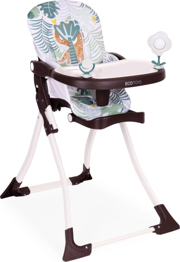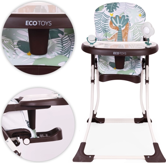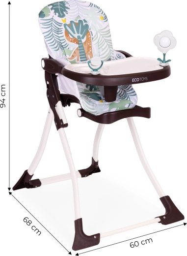 Jedilni stolček ECOTOYS olajša skupno obedovanje ter ohranja vašega malčka v udobju in varnosti. Širok pladenj nudi dovolj prostora za krožnik, skodelico in igro – vključeni sta vrtljiva igračka in ropotuljica, ki zabavata in spodbujata čute. Zložljiva konstrukcija prihrani prostor v manjših interierjih in olajša transport.