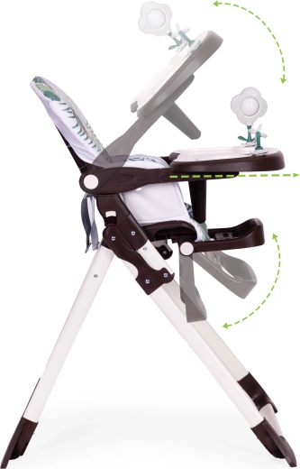Širok, nastavljiv in dvoplasten pladenj z odstranljivo zgornjo vložko je enostaven za čiščenje. Vgrajene igrače zabavajo otroka med čakanjem na obrok in spodbujajo razvoj motorike.