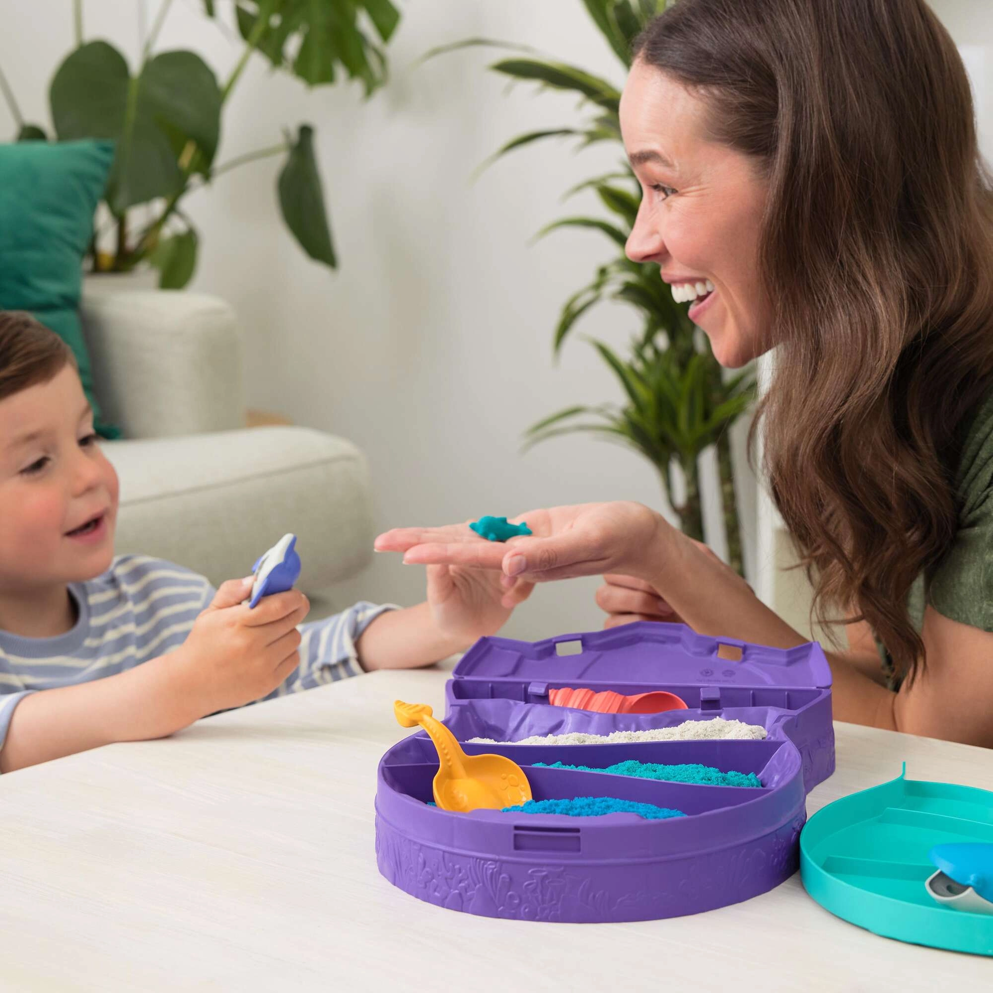 Kinetični pesek Kinetic Sand posnema občutek mokrega peska, vendar brez umazanije in izsuševanja. Otroci lahko zlahka oblikujejo, režejo, stiskajo in gradijo, medtem ko urijo koordinacijo in ustvarjalnost. Set Deep Sea ponuja kombinacijo modre, bele in zelene za ustvarjanje zabavnih podmorskih prizorov in oblik.