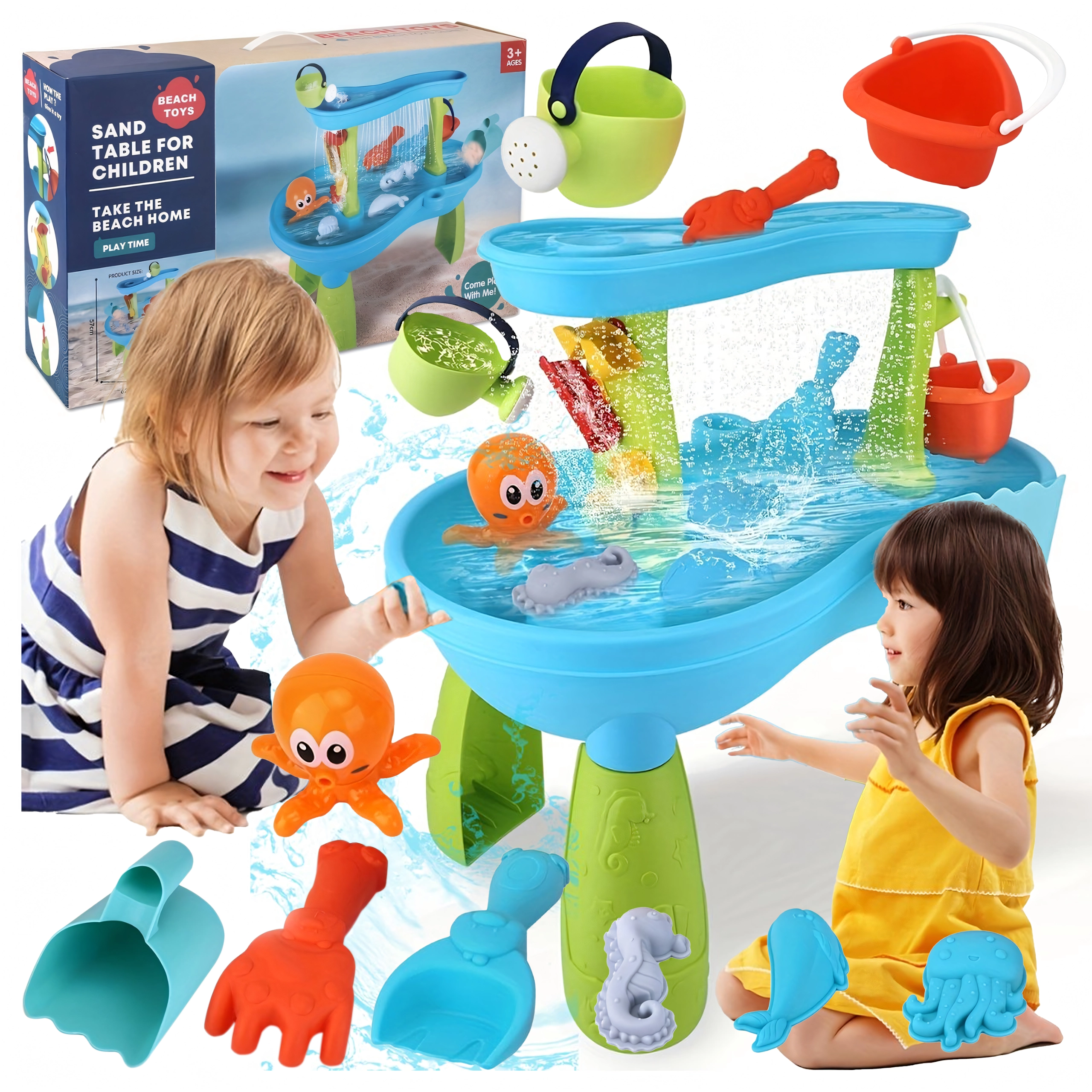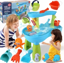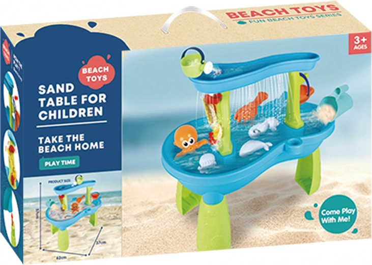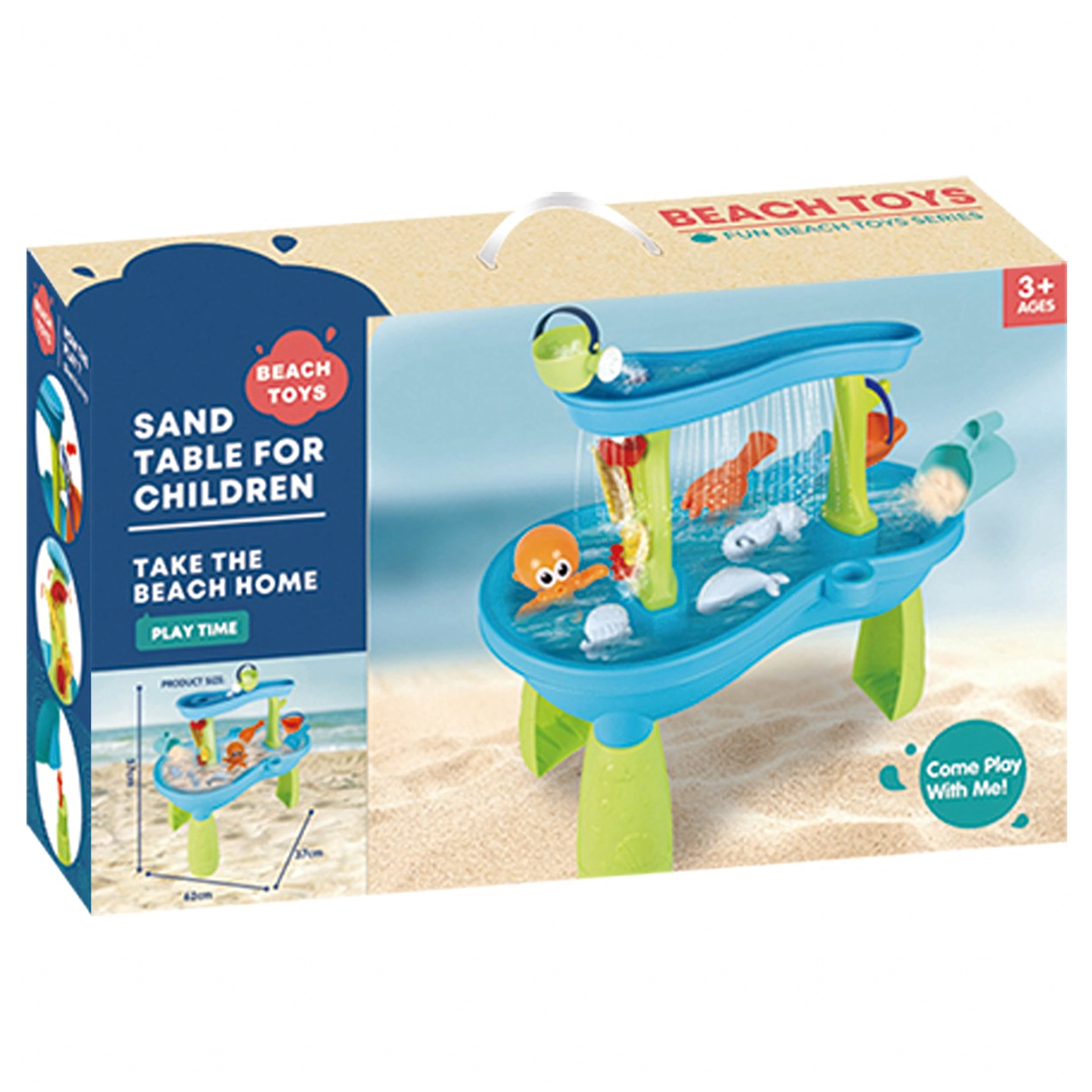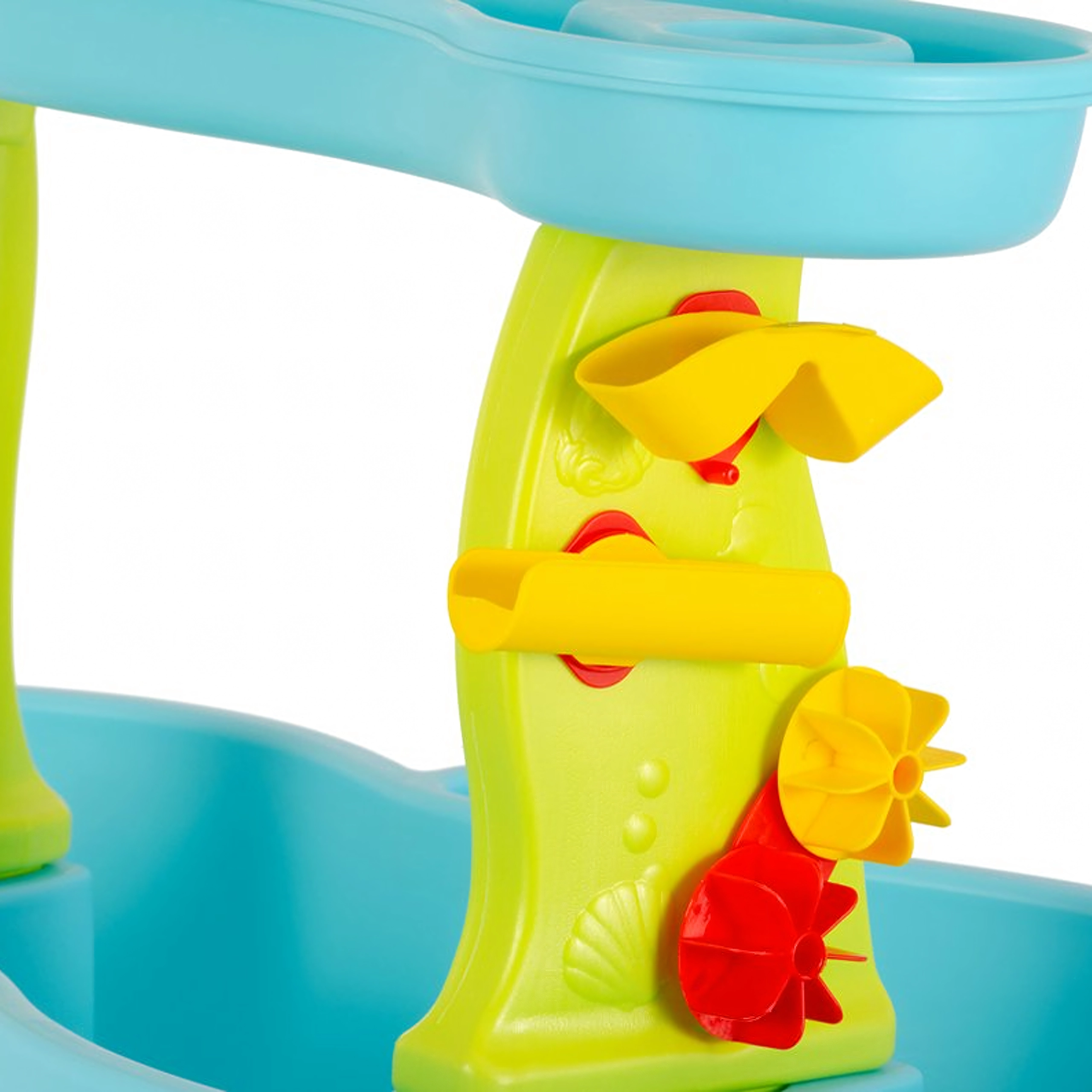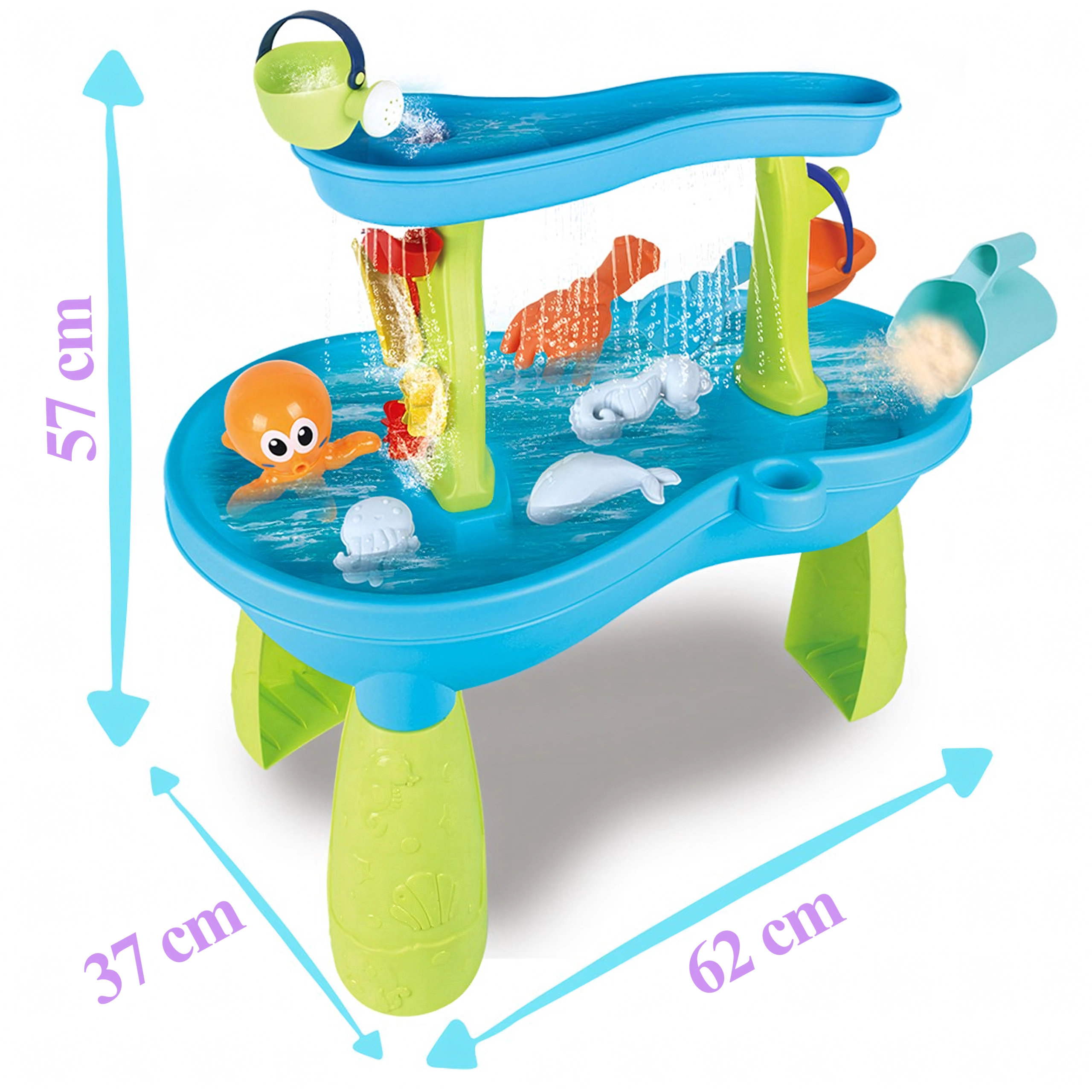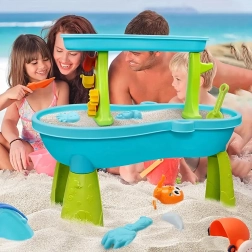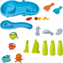 V kompletu je bogat nabor dodatkov: lopatke, vedra, zalivalka, modelčki morskih živalic, drče in vodni prelivi. Zahvaljujoč več igralnim območjem in domiselnim žlebovom je igra raznolika, spodbuja sodelovanje otrok in razvija njihovo domišljijo.