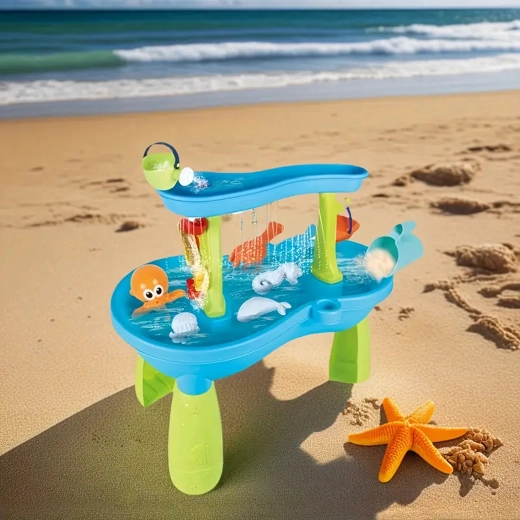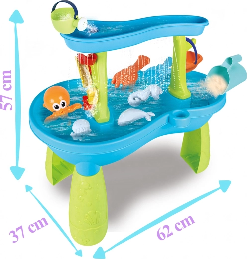 Zabavna vodna in peskovna mizica 2v1 prinaša otrokom ure zunanje igre. Vključuje barvite dodatke, drče in vodne kolesnice, modelčke in orodja za pesek ter vedra in zalivalke. Spodbuja čutno zaznavanje, fino motoriko in kreativno igro ob vodi in v pesku – idealno za vrt, teraso in plažo.