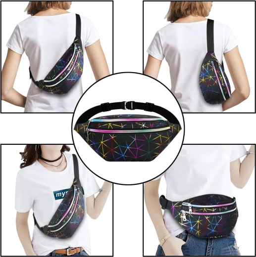 Ta praktična torbica za pas je odlična izbira za vsakodnevno nošenje, potovanja in prosti čas. Holografski geometrijski vzorec daje izviren videz, medtem ko premišljena razdelitev na tri zadržne predele vse varno ohranja na mestu. Sprednja žepa sprejmeta tudi velik pametni telefon, zadnji žep je idealen za vrednejše stvari.