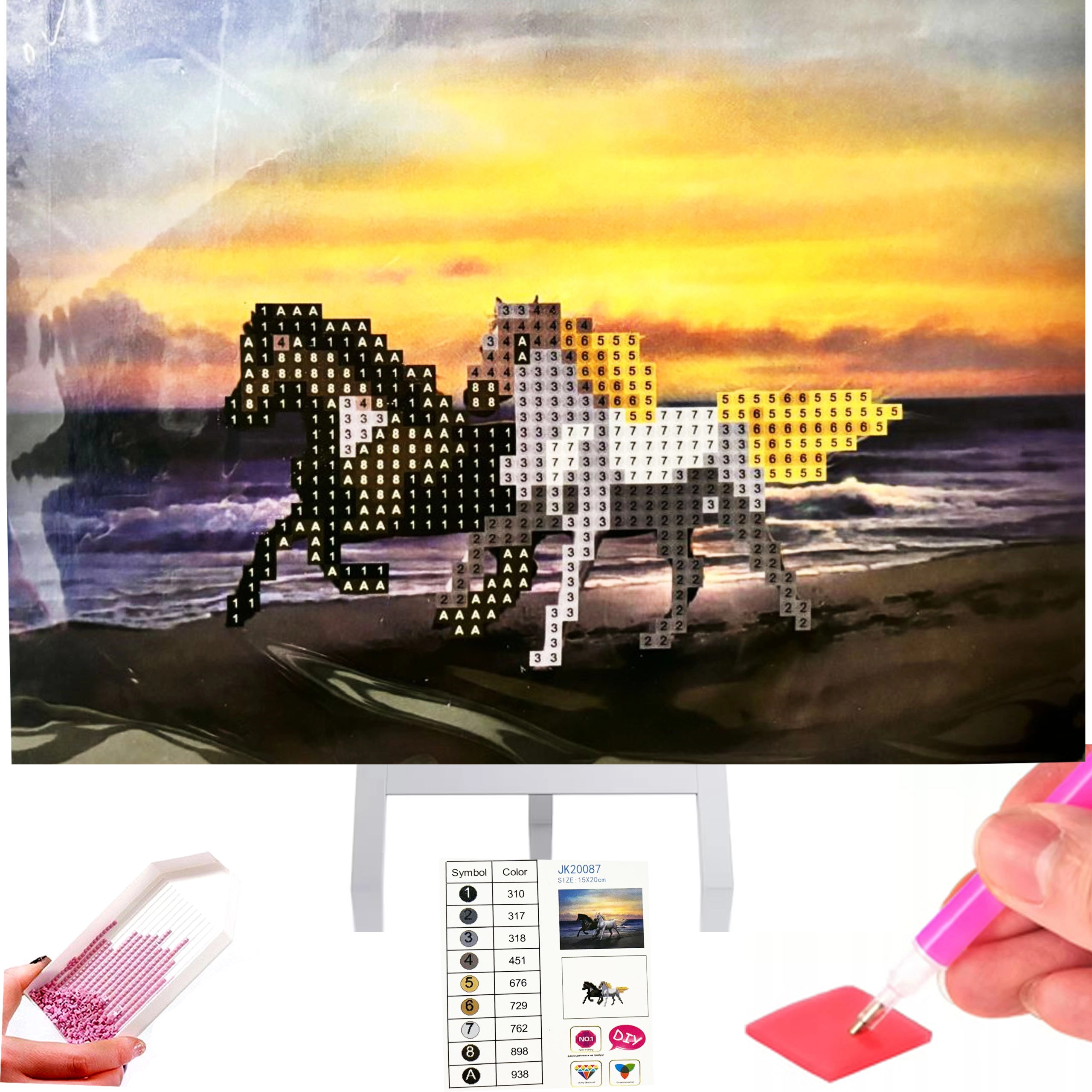 Del pakiranja je tudi majhno belo stojalo, na katerega lahko končano sliko preprosto postavite na polico ali mizo. Set je odličen darilni namig – za rojstni dan, praznike ali kot kreativna zabava za proste trenutke. Zahvaljujoč mešanici vzorcev in barv je vsak projekt edinstven.