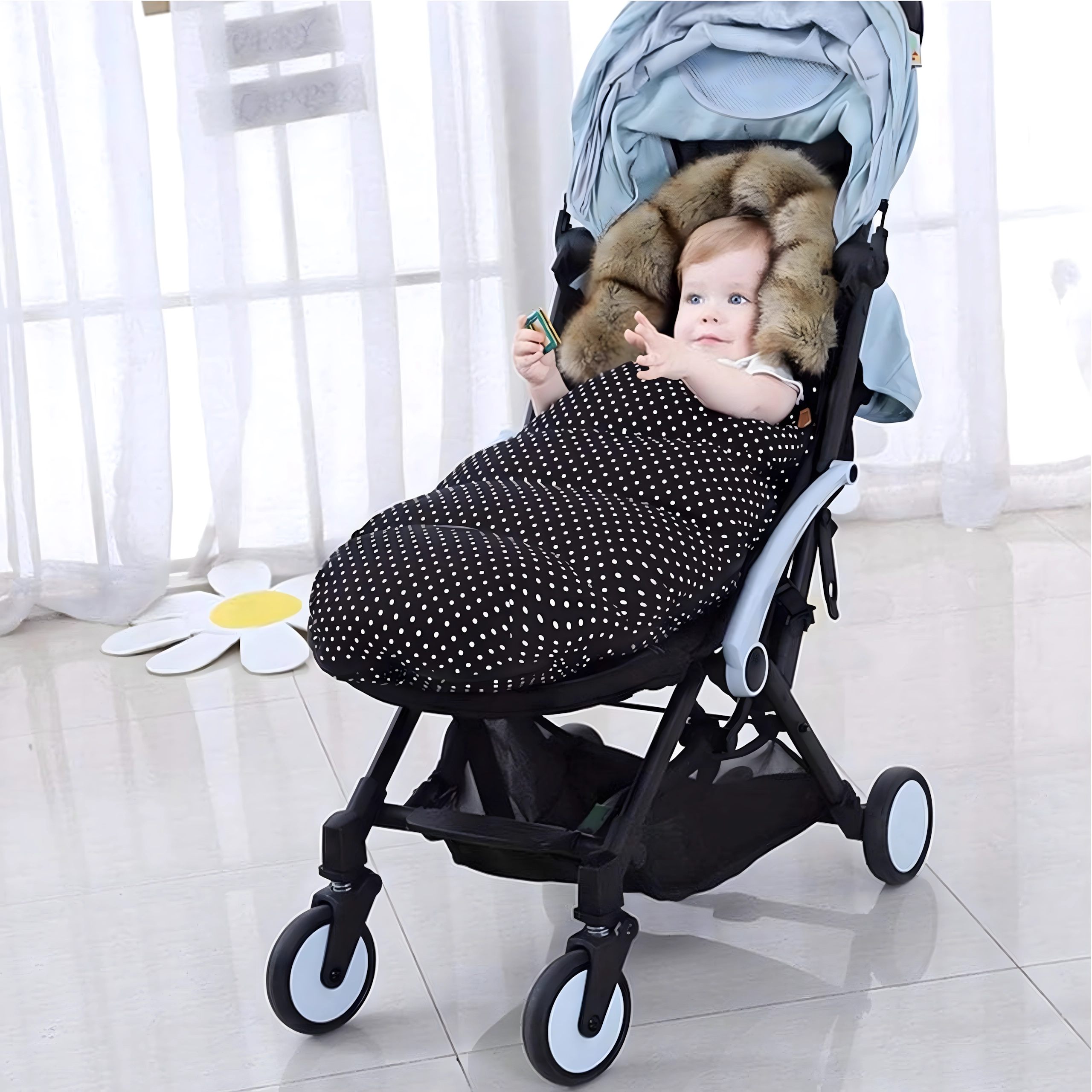 Notranja podloga iz nežnega mikroflisa je prijetna na dotik, greje in poveča skupno udobje med vožnjo v vozičku.