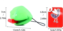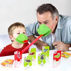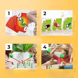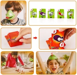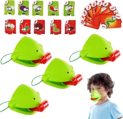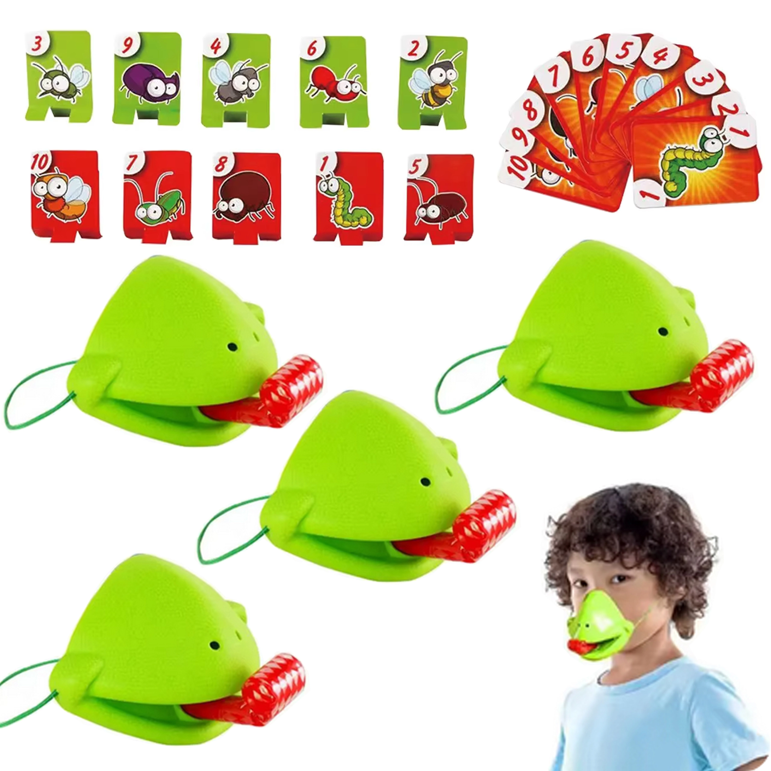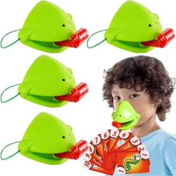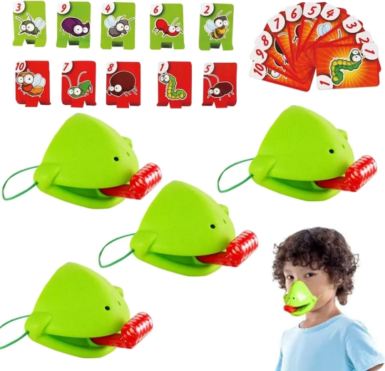 Set vsebuje vse za 4 igralce: lahke žabje maske z elastičnim trakom in “jezikom” ter barvite kartice. Igra spodbuja hitre reakcije, koordinacijo oko–roka in zbranost. Idealno za družinske večere, otroške zabave in sproščene trenutke doma.