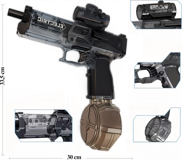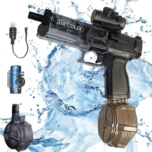 Ta zmogljiva električna vodna pištola prinaša dinamično in udobno igro za otroke in odrasle. Zahvaljujoč avtomatskemu sprožanju izstreljuje stalen curek vode brez potrebe po črpanju, medtem ko kapacitetni rezervoar poskrbi za redkejše dolivanje. Vgrajena polnilna baterija prek USB omogoča do 35 minut zabave z enim polnjenjem.