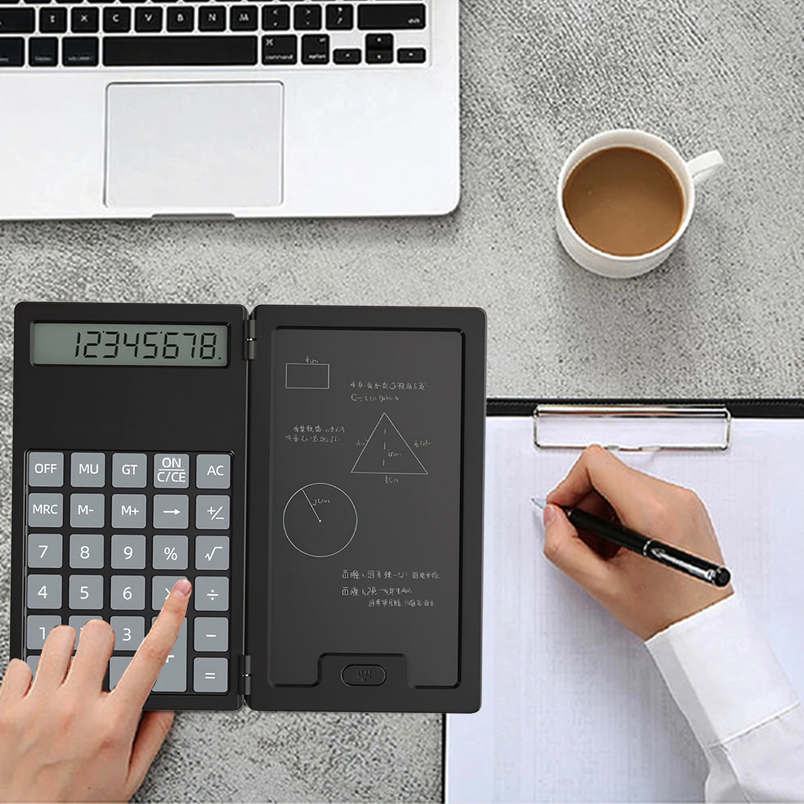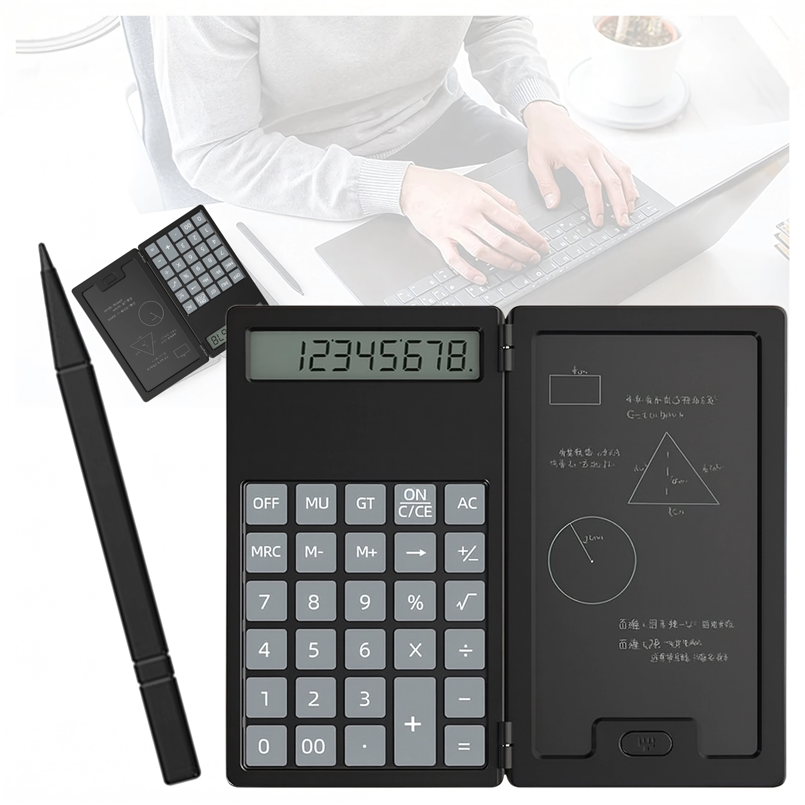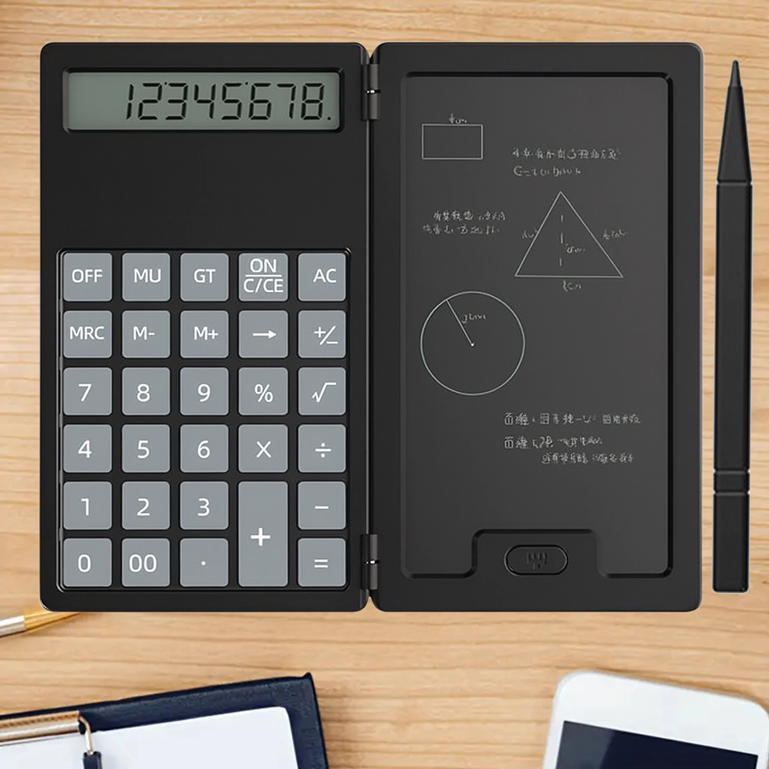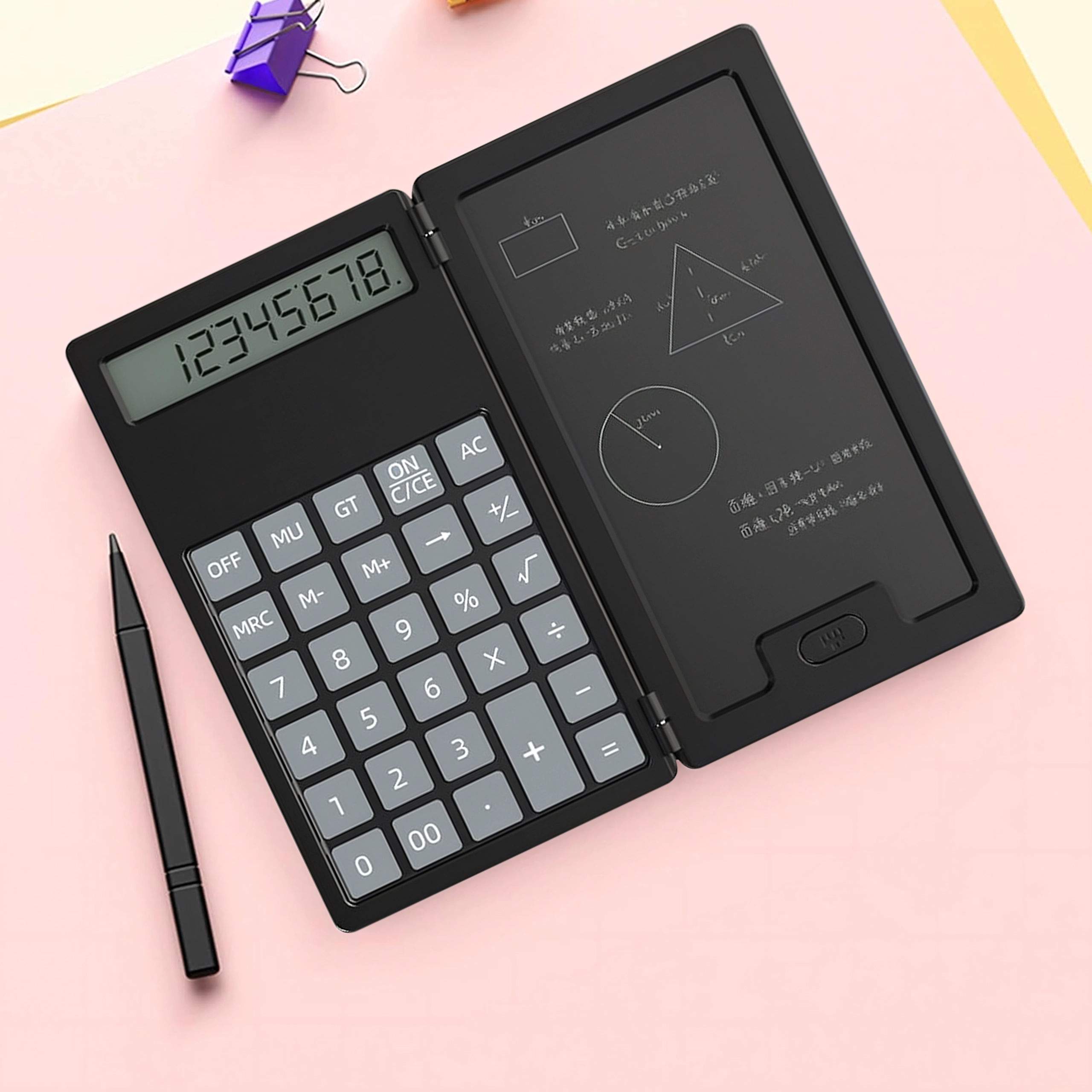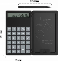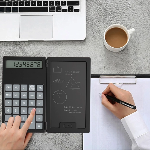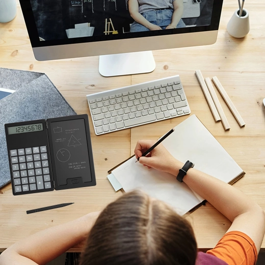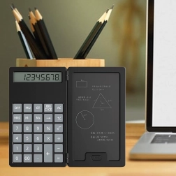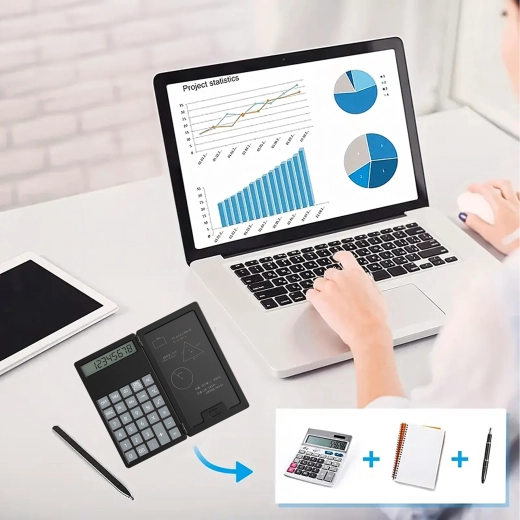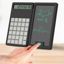 Ta pametni kalkulator z zložljivim ohišjem združuje klasično računanje s praktično LCD tablo za zapiske. Zahvaljujoč lahki in tanki zasnovi ga zlahka pospravite v torbo ali žep ter ga imate vedno pri roki za hitre izračune in opombe.