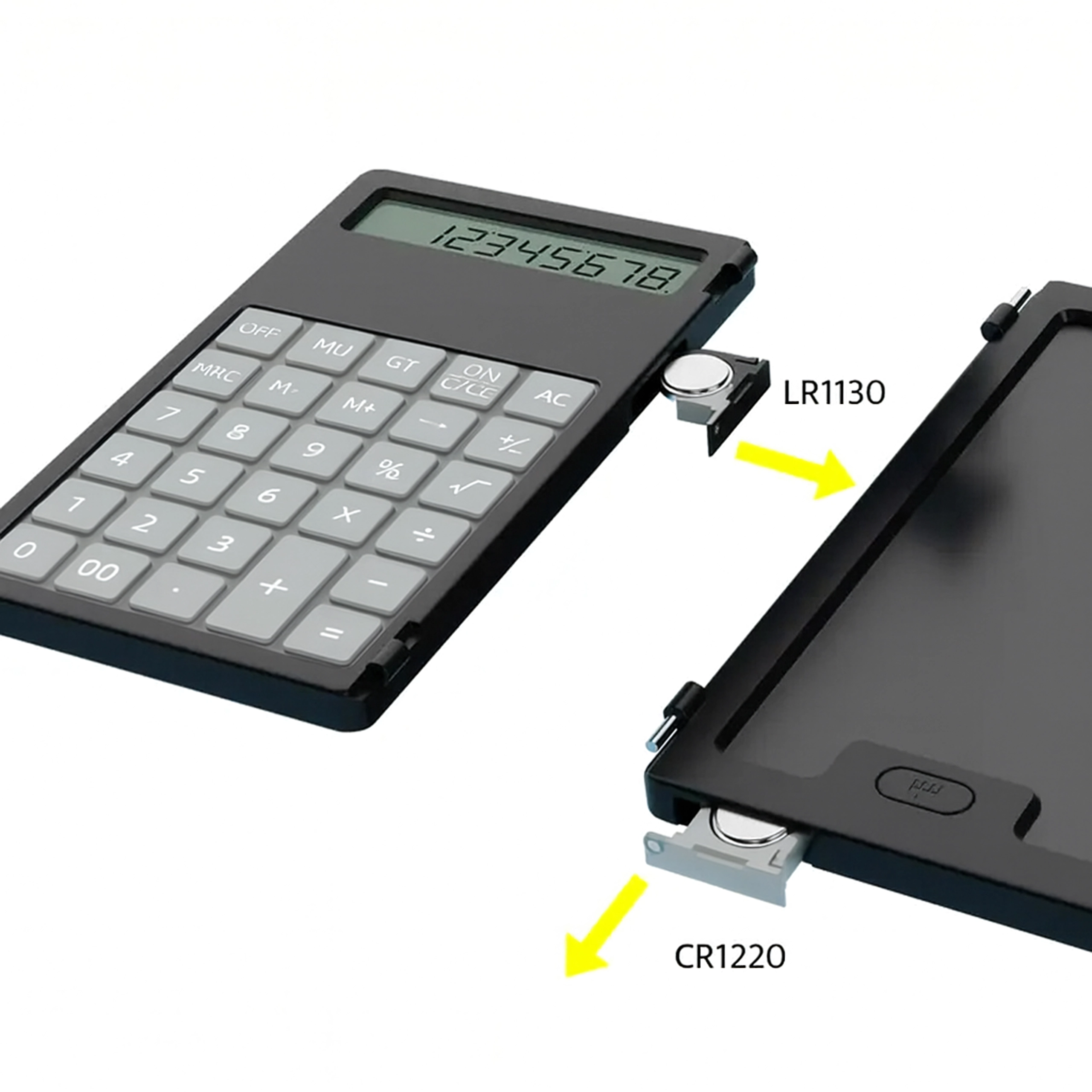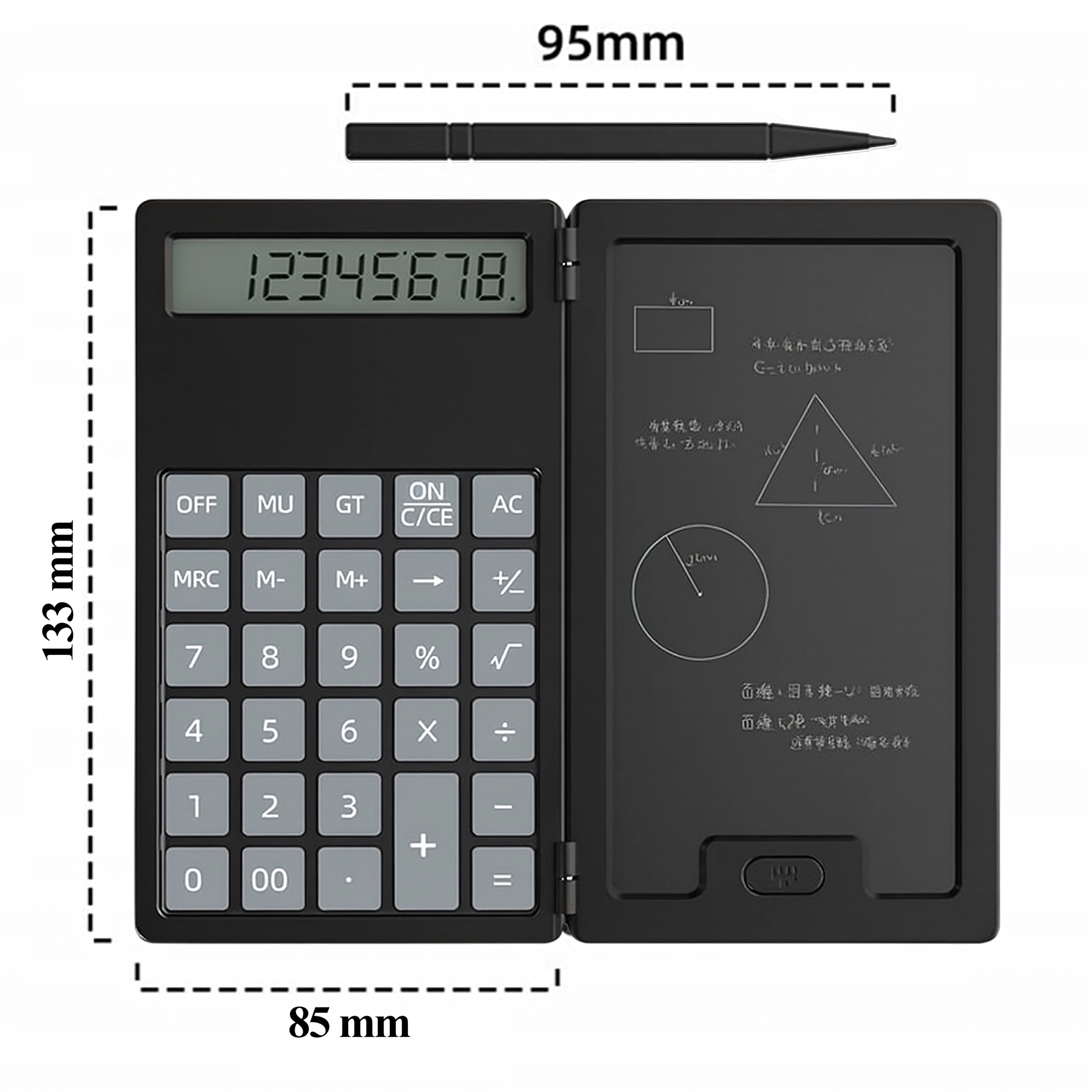 Na levi strani natančen kalkulator, na desni LCD površina za hitre zapiske – idealno za izračune, formule in skice brez papirja.