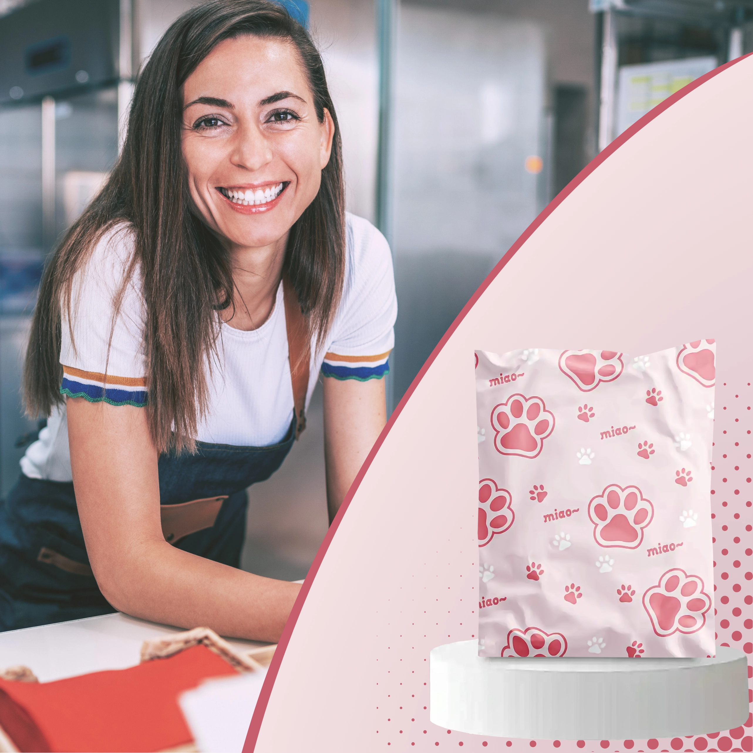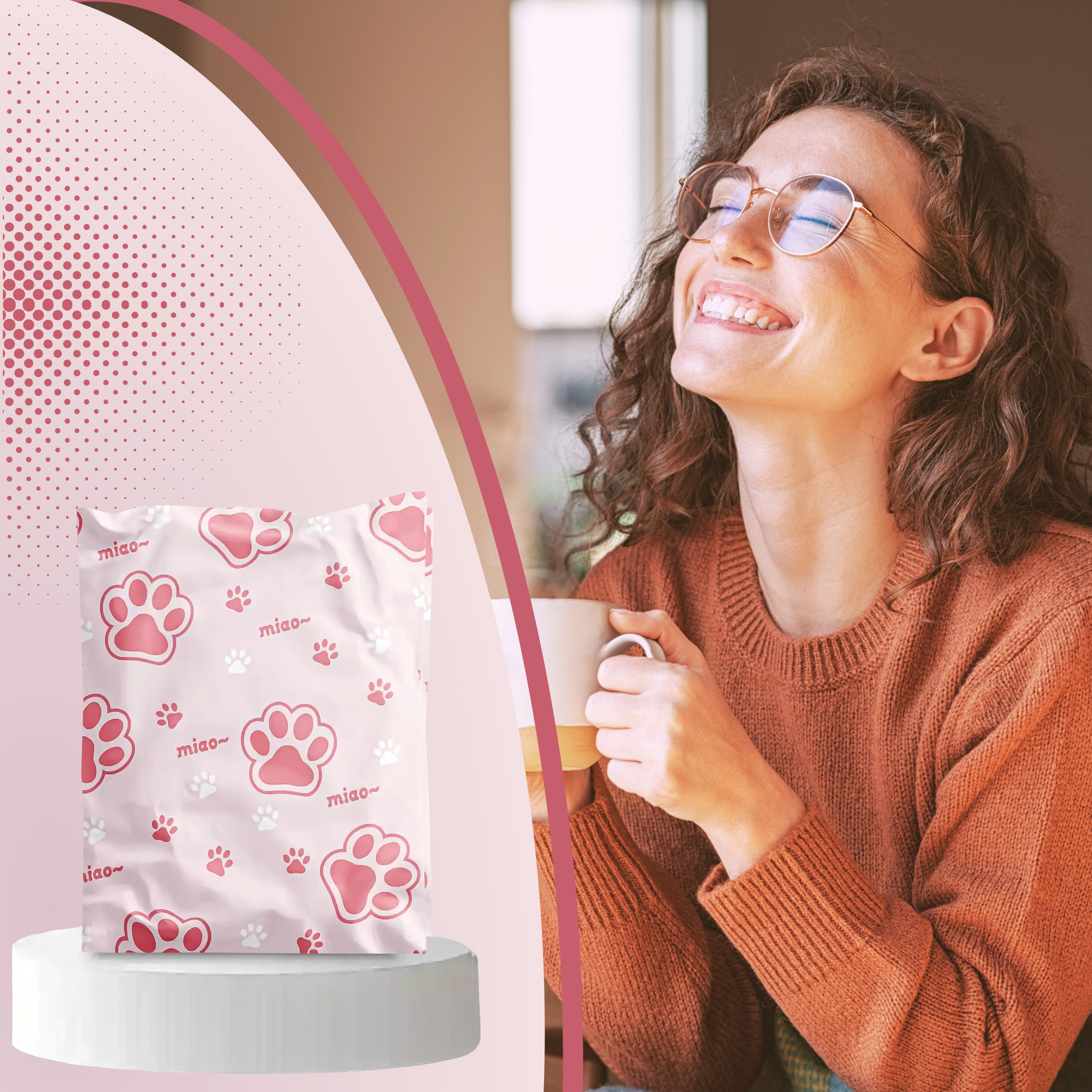 Rožnata izvedba z napisom »miao« ustvari prijetno izkušnjo ob razpakiranju in poudari skrb za kupca.