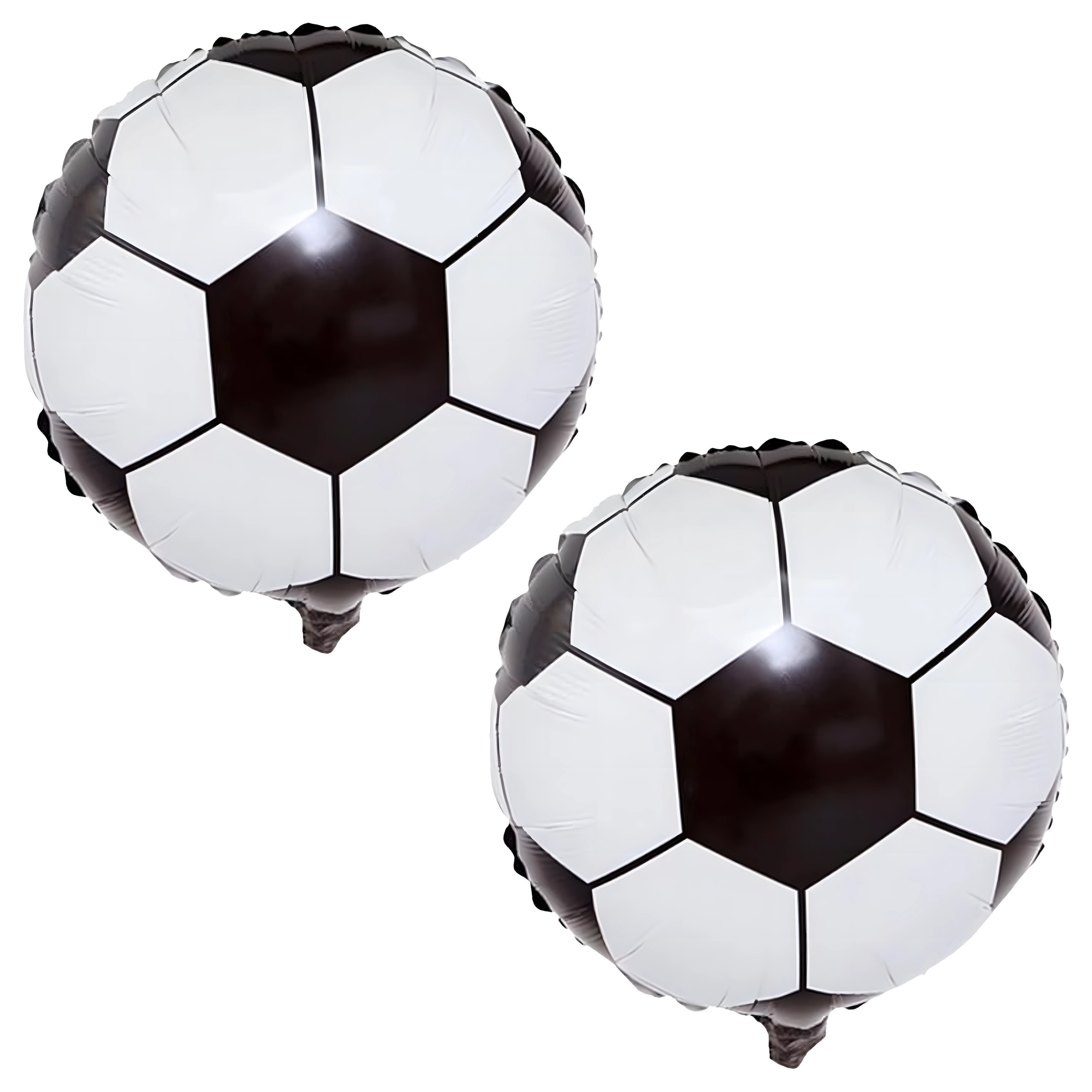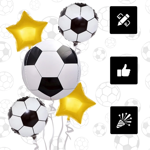 Stilska dekoracija za zabavo za male in velike nogometne navdušence. Ta komplet vsebuje 5 balonov: 1 velik folijski balon – žoga približno 56 cm, 2 folijska balona v obliki nogometne žoge približno 46 cm in 2 zvezdi v zlati barvi približno 46 cm. Idealno za rojstnodnevno dekoracijo, nogometne zabave in tematske dogodke.