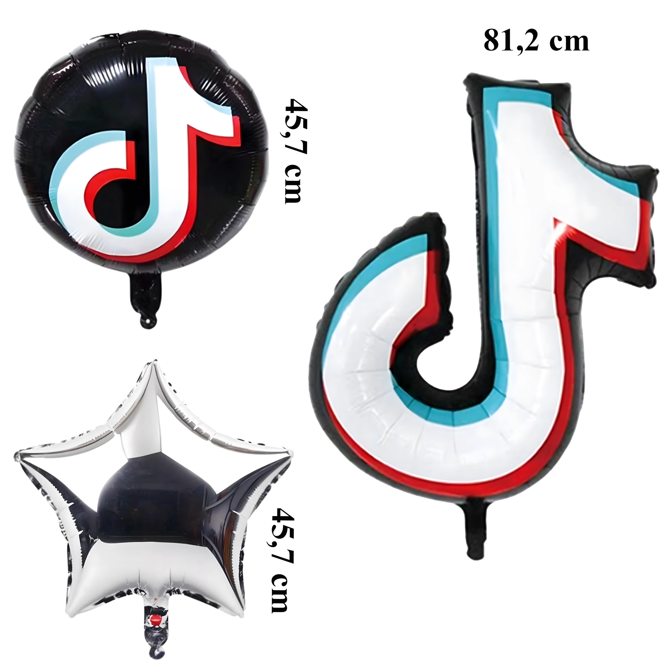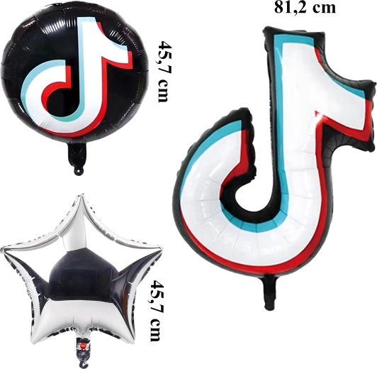 - Vsebina kompleta: 1× folijska nota 81,2 cm, 2× črn okrogel balon TikTok 45,7 cm, 2× srebrna zvezdica