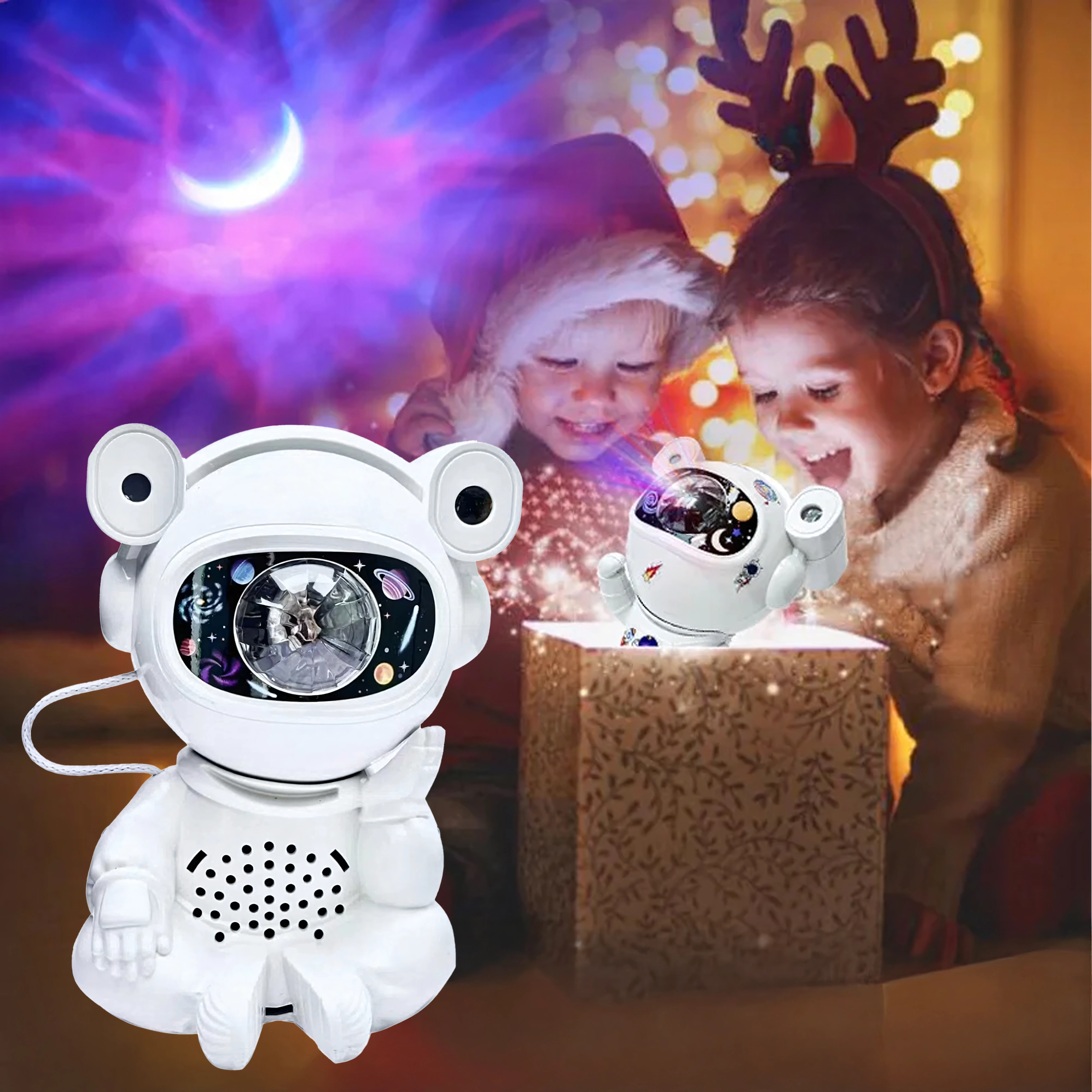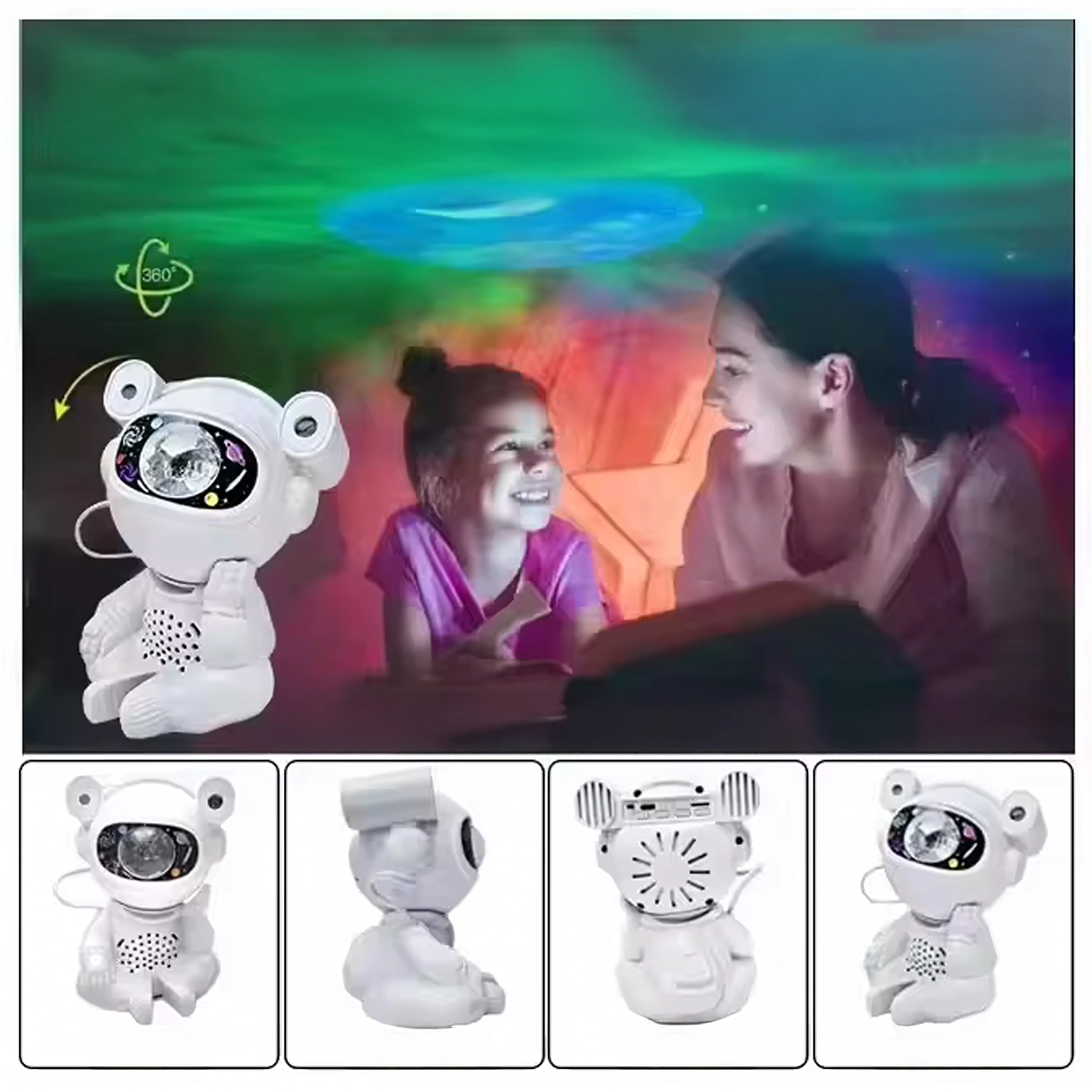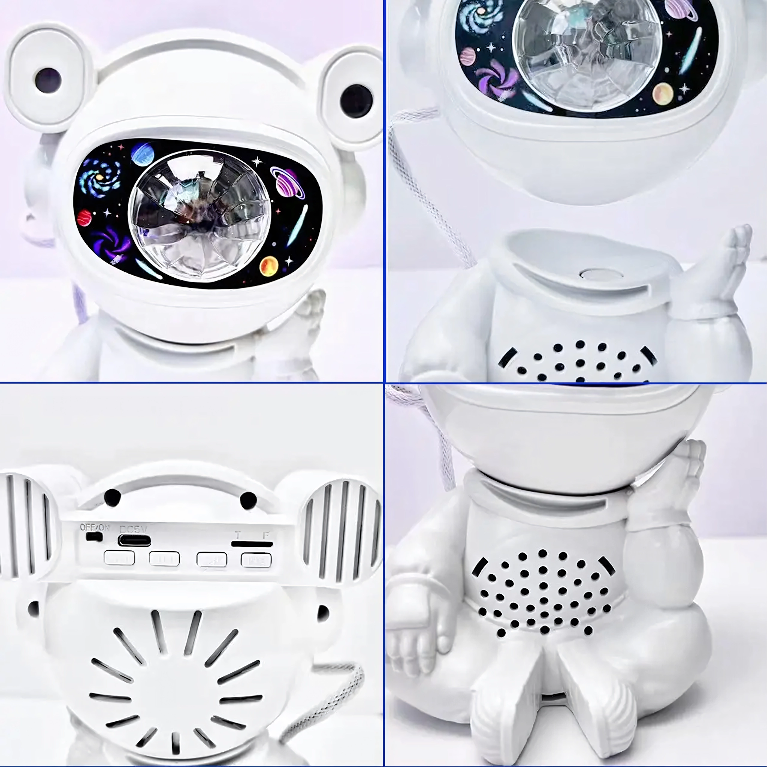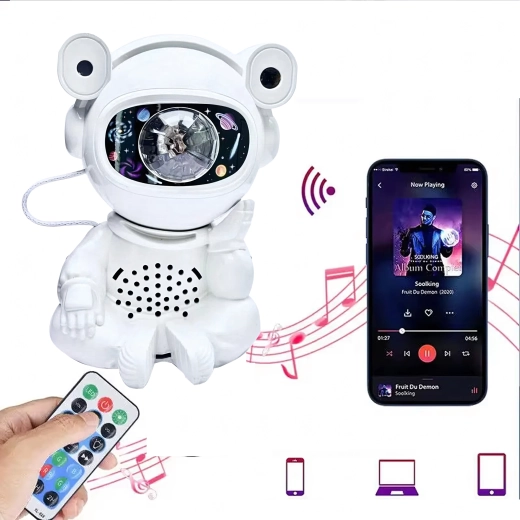 Odkrijte miren spanec in pomirjujočo projekcijo zvezd s svetilko v obliki astronavta s premično glavo. Projekcija ustvari na stropu in stenah impresivno galaksijo zvezd in meglic, ki spodbuja domišljijo otrok in pričara prijetno vzdušje za počitek.