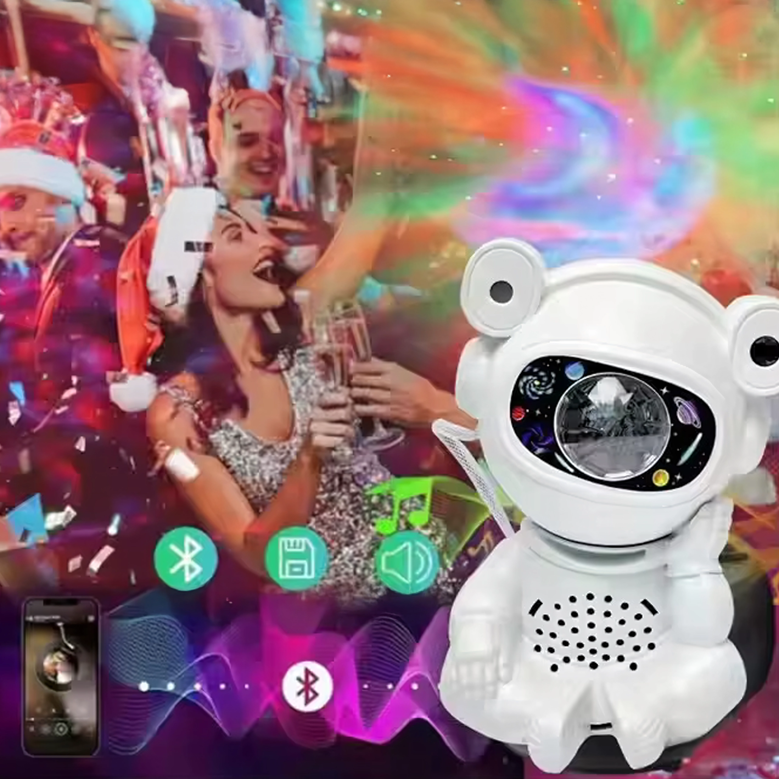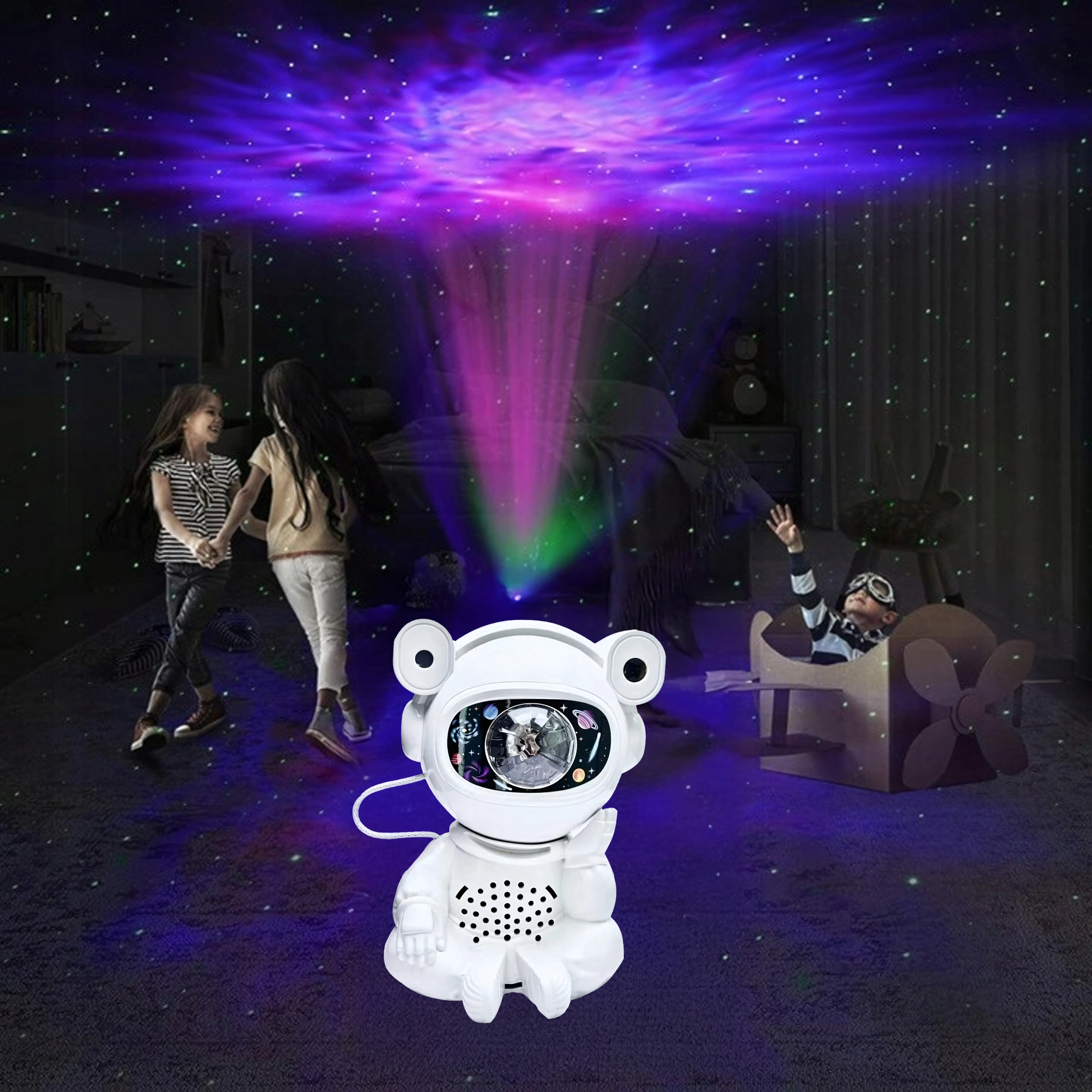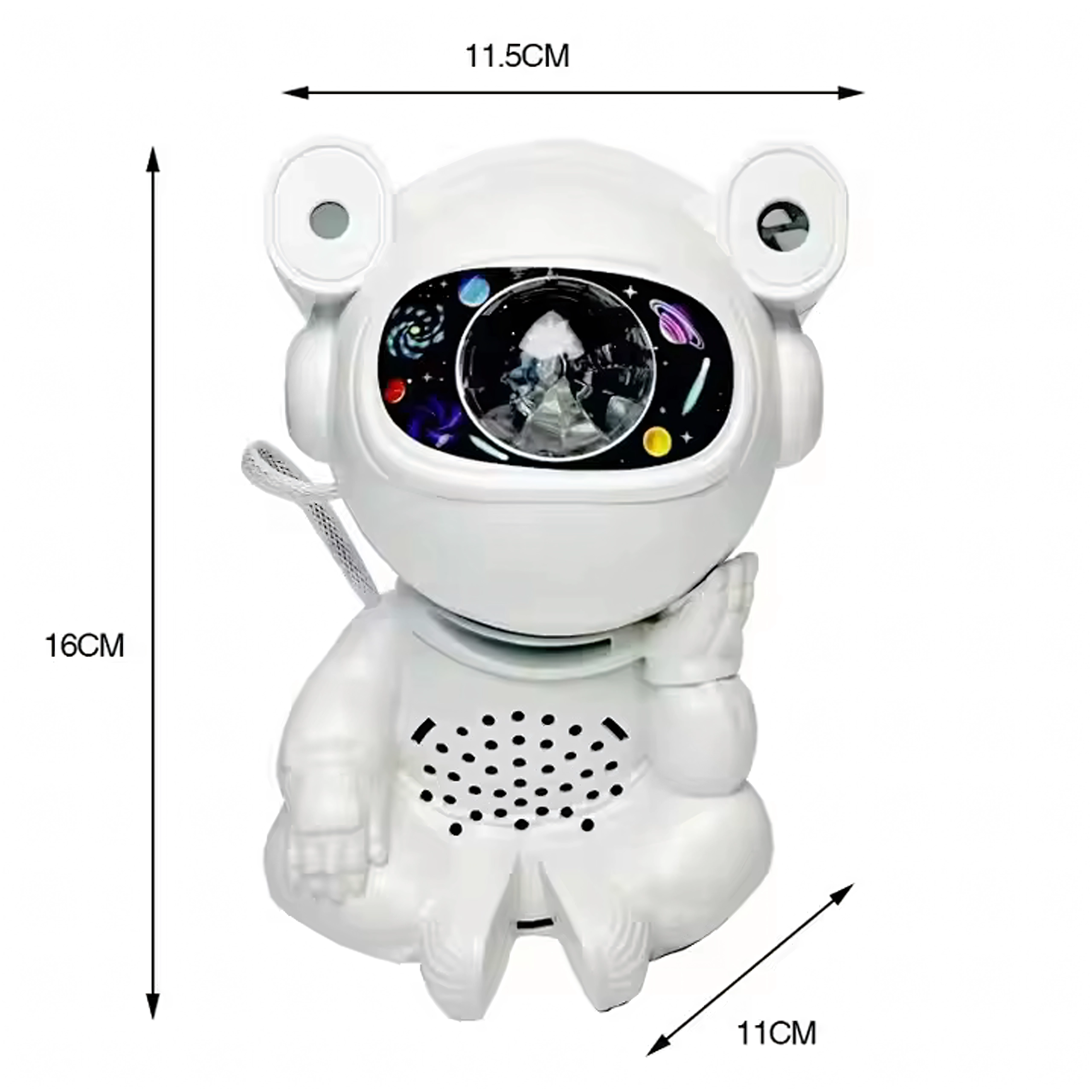 Odkrijte miren spanec in pomirjujočo projekcijo zvezd s svetilko v obliki astronavta s premično glavo. Projekcija ustvari na stropu in stenah impresivno galaksijo zvezd in meglic, ki spodbuja domišljijo otrok in pričara prijetno vzdušje za počitek.