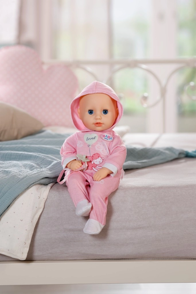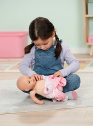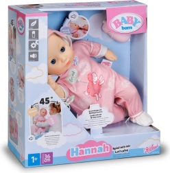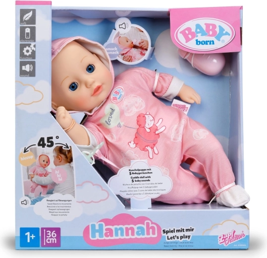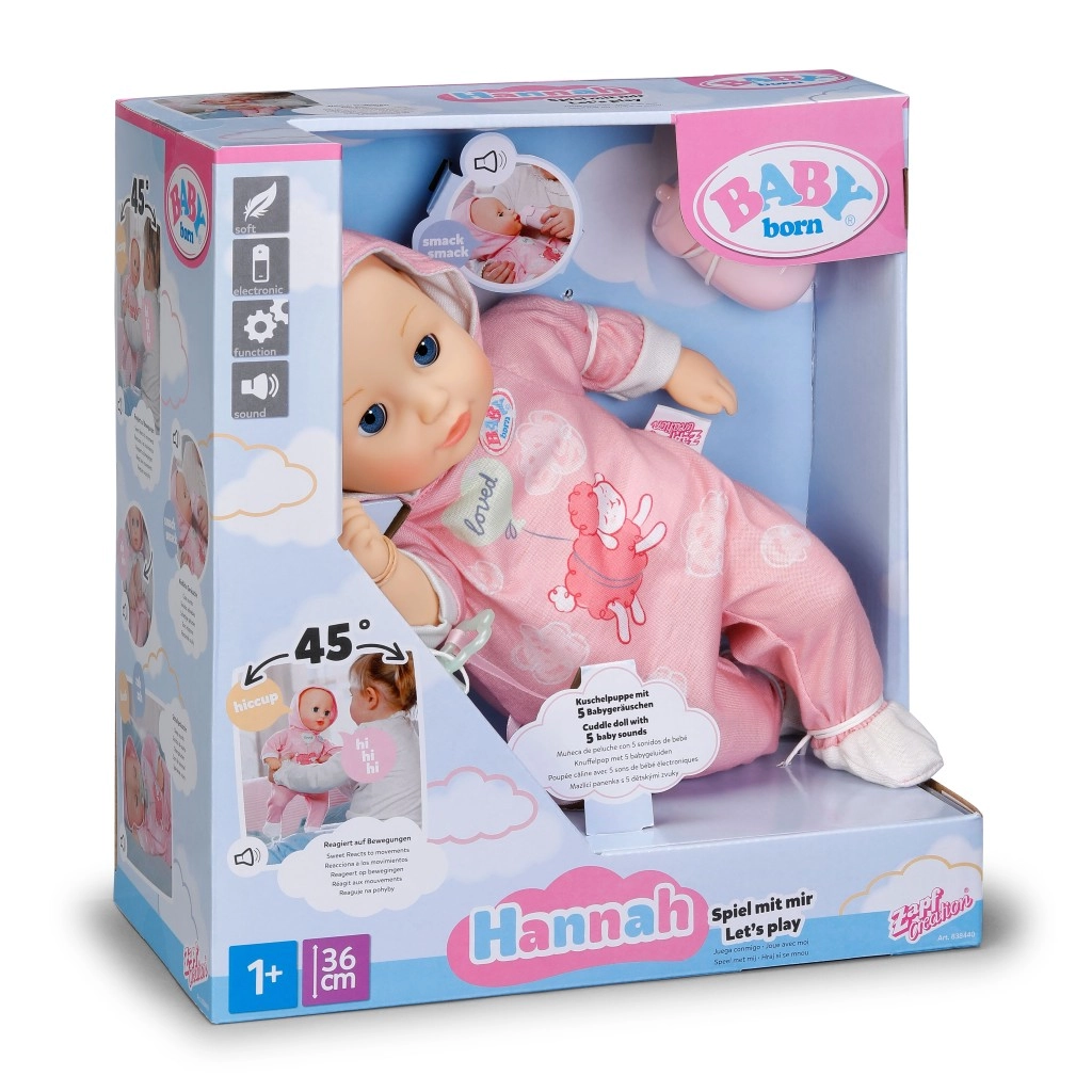 Odkrijte čar negovalnih iger s punčko BABY born Hannah – pojdimo se igrat. Zaradi mehkega telesčka je prijetna na dotik, lepo sede v naročje in vabi k crkljanju. Otroci bodo vzljubili preprosto interakcijo – punčka oddaja sladke otroške zvoke, ob hranjenju s stekleničko se slišijo prisrčni zvoki pitja, ob uspavanju pa tiho prede in zapira oči.