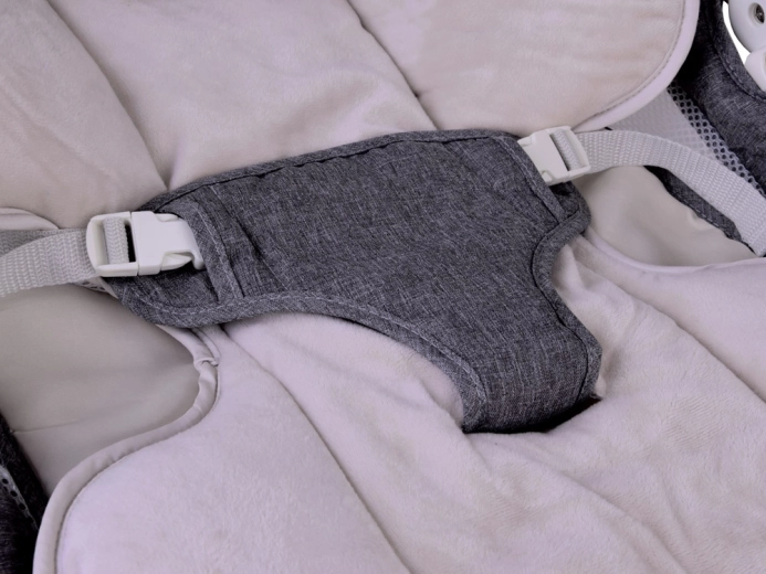 Mehko oblazinjen sedež z vložkom in nastavljivim naslonom ohranja dojenčka v ergonomski drži. Pettočkovni pasovi in stabilna osnova zagotavljajo zanesljivost pri počitku in guganju.