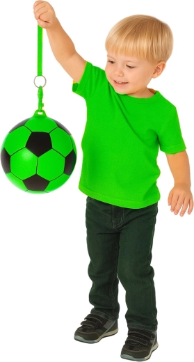 Lahka in prožna gumijasta žoga z nogometnim vzorcem motivira otroke k gibanju ter razvija koordinacijo in spretnost. Živahna zelena barva zagotavlja odlično vidljivost na vrtu, igrišču in plaži. Praktično držalo za pritrditev vrvice omogoča trening driblanja, refleksov in natančnosti brez nenehnega tekanja za žogo.