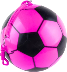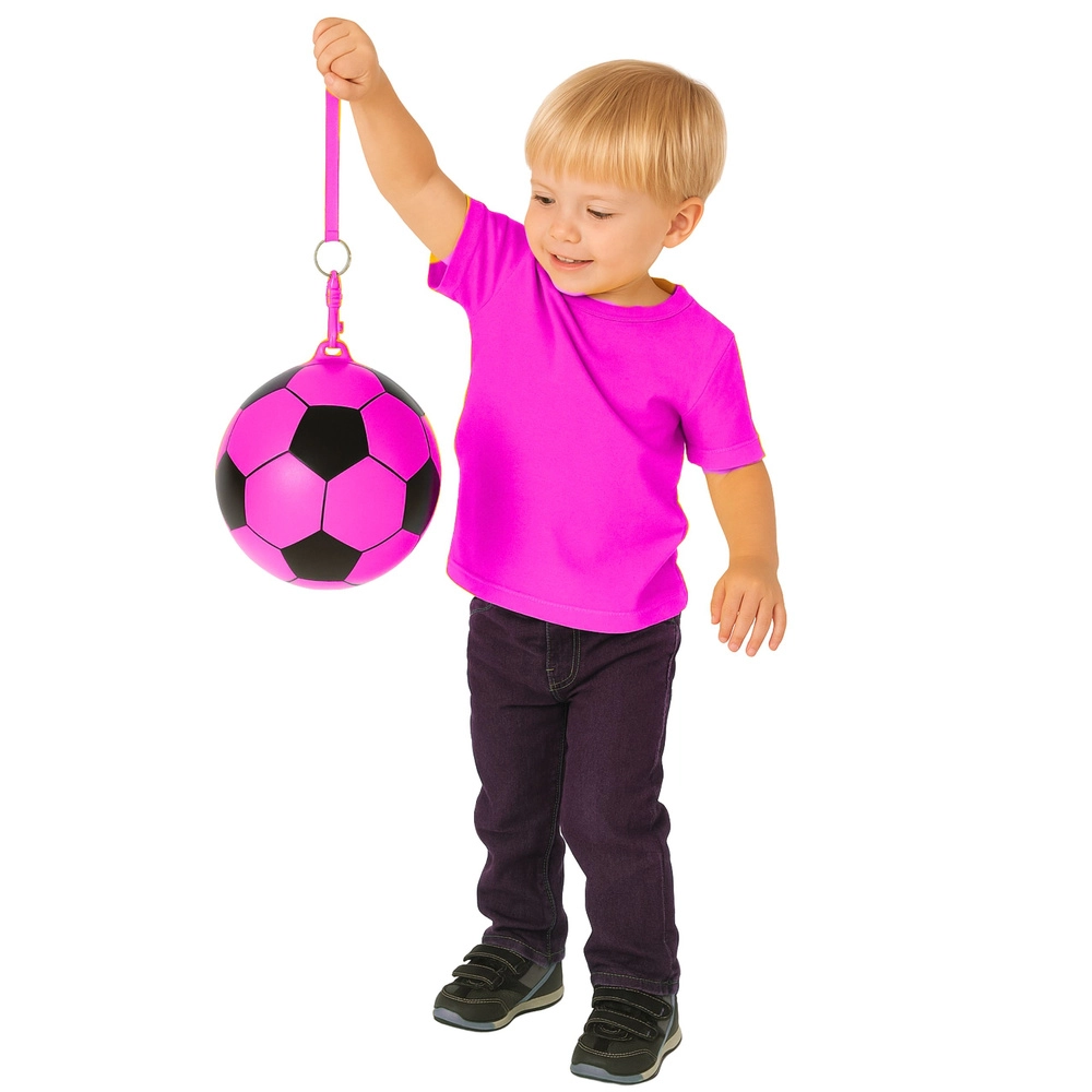 Rožnata gumijasta žoga s premerom 22 cm v vzorcu nogometne žoge je odlična za igro doma in na prostem. Je lahka, prožna in trpežna, odlično se odbija in jo je zaradi elastičnega držala mogoče pritrditi na vrvico za trening odzivnosti in zabavne igre.
