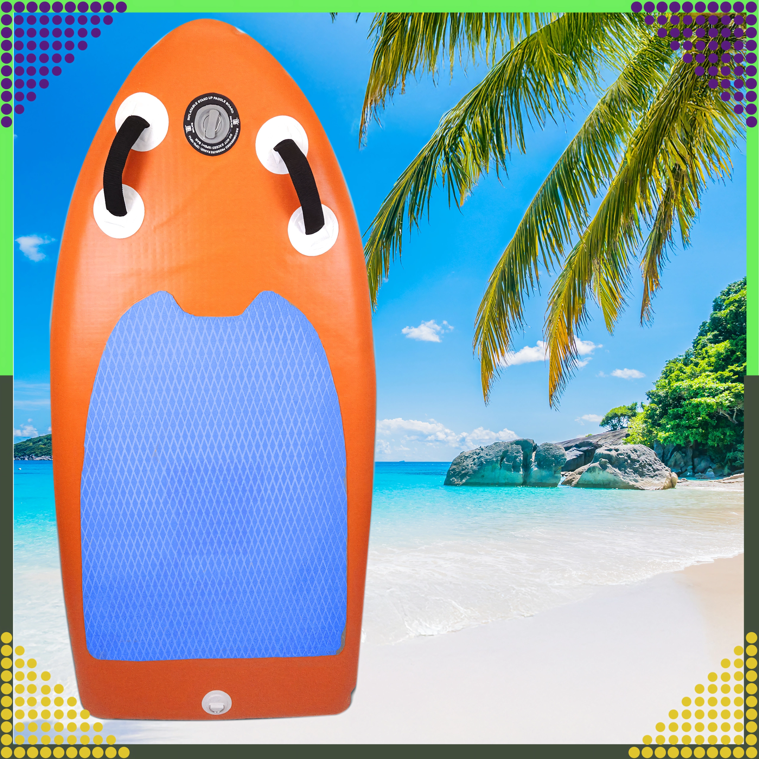 Ta napihljiva mini SUP deska je odlična izbira za otroke, najstnike in odrasle, ki želijo živahno in zabavno desko za mirne vode in krajše izlete. Konstrukcija s kompozitno površinsko plastjo in ojačanim PVC zagotavlja vzdržljivost in dolgo življenjsko dobo, medtem ko udobna nedrseča EVA podloga z diamantno strukturo zagotavlja zanesljiv oprijem tudi, ko je mokra.