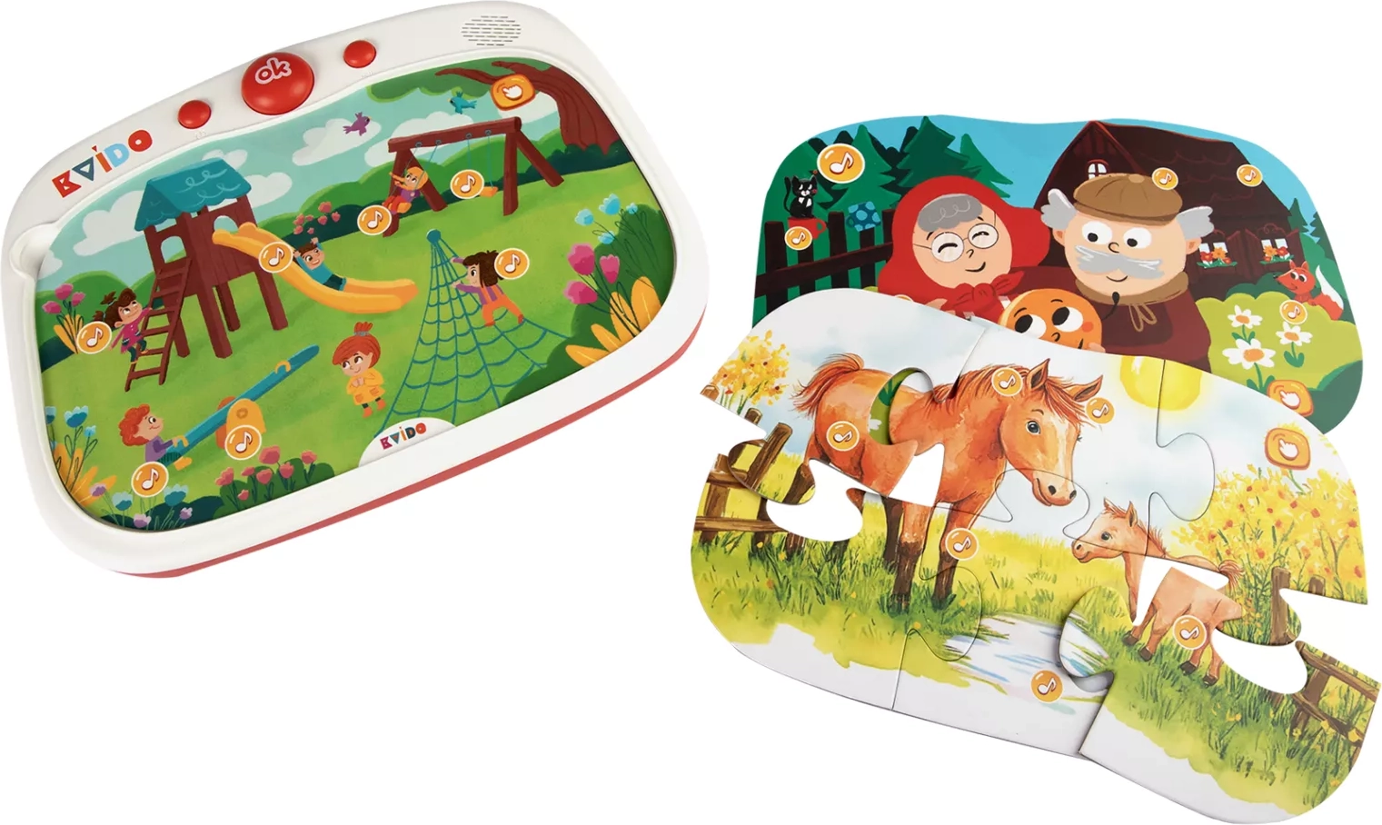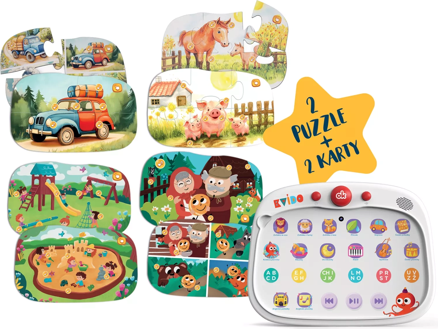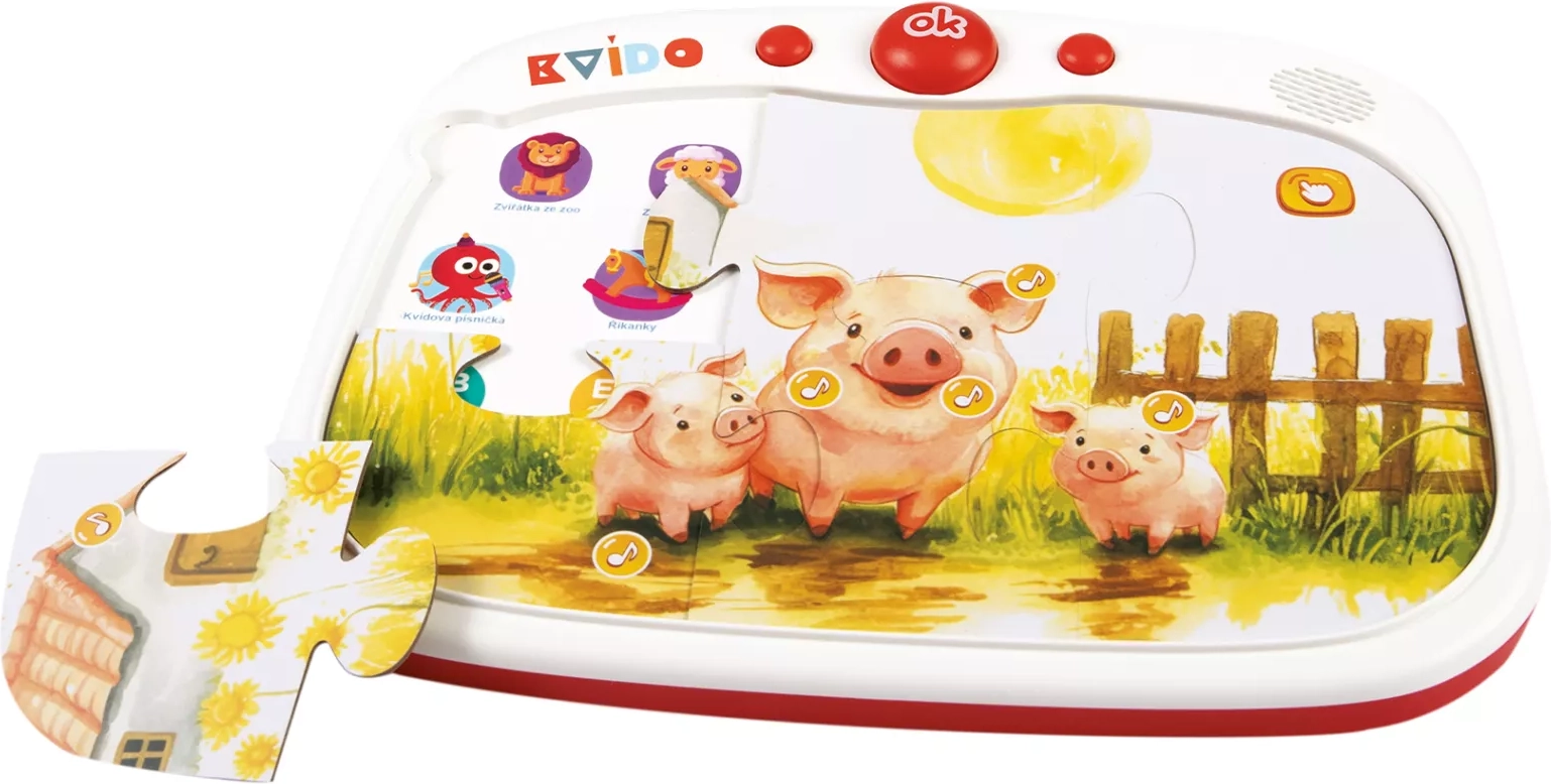 Govoreča tablica KvÍdo je pametna izobraževalna igrača, ki povezuje dotikalno elektroniko z dvostranskimi puzzlami in karticami. Dovolj je, da na tablico položite sestavljene puzzle ali kartico, in otroci takoj slišijo zvoke živali, narave in prometa, pesmice, izštevanke ter kratke pravljice. Idealno za predšolske in mlajše šolske otroke.