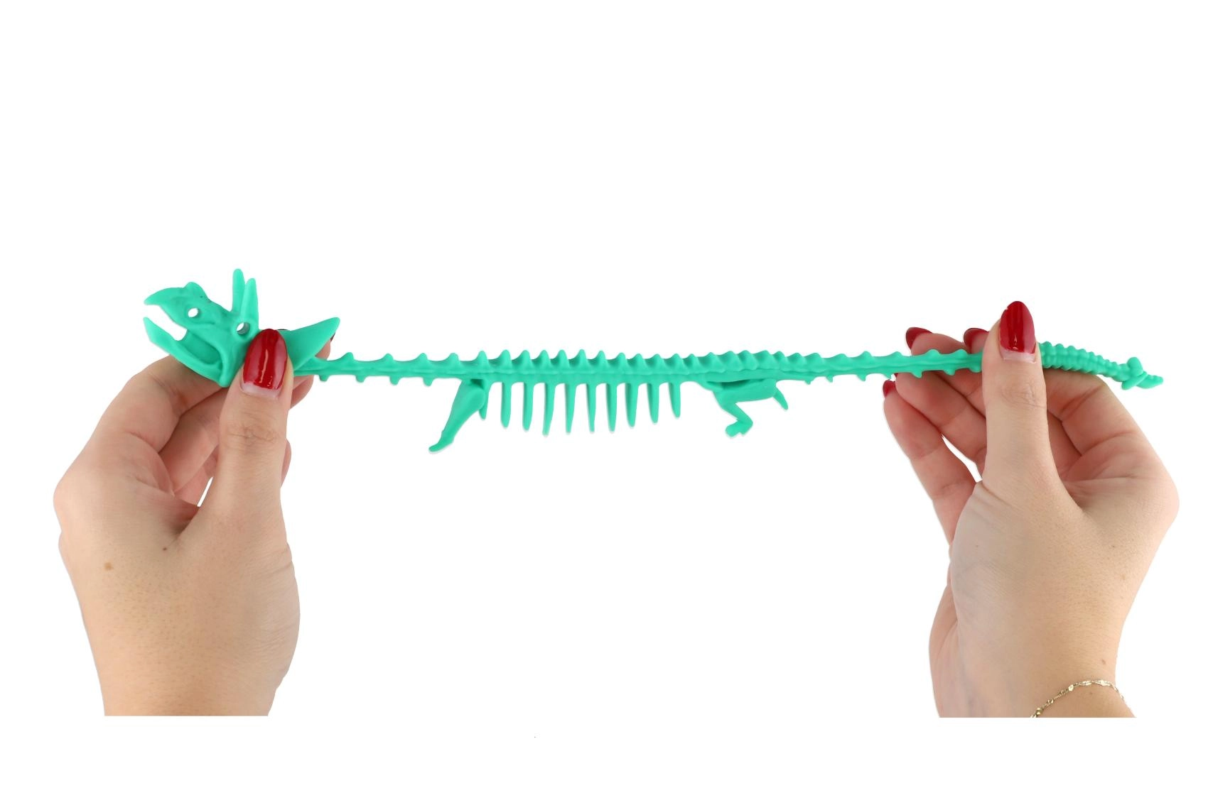 Z dolžino 22 cm odlično leži v roki otrok in odraslih. Primerna kot fidget dodatek za šolo, pisarno in na poti. Izrazite barve in podroben “kostni” dizajn podpirajo taktilno stimulacijo in igrivo domišljijo.