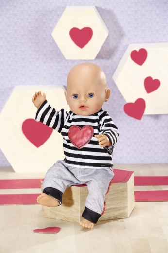 Stilna kompletna oprava za punčke Dolly Moda prinaša udobje in šarm za vsakodnevno igro. Zahvaljujoč univerzalnemu kroju odlično pristaja punčkam velikosti 39–46 cm, vključno z BABY born in Baby Annabell. Set vsebuje črtasto jopico z dolgimi rokavi in velikim rdečim srcem ter udobne sive trenirke s kontrastnimi patenti in rdečimi stranskimi črtami. Univerzalna velikost, kakovostna izdelava in spodbuda ustvarjalnosti ter igre vlog naredijo ta komplet odličen dodatek za vsako punčko.