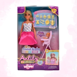 Igralni set družinske igre s punčko Lily otrokom prinaša avtentično izkušnjo nege dojenčka. Punčka-mamica ima dolge, razčesljive lase in gibljive okončine, dojenčka lahko udobno posadite v visok stolček in ga nahranite s priloženimi skledicami, stekleničkami, lončki in priborom. Realistični detajli spodbujajo naravno radovednost ter učijo otroke empatije in odgovornosti.