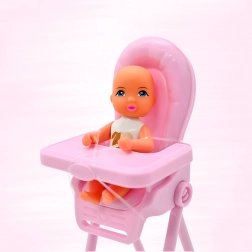 - Punčka-mamica v obleki, dojenček, visok stolček za hranjenje, set posodic in dodatkov (10 kosov)