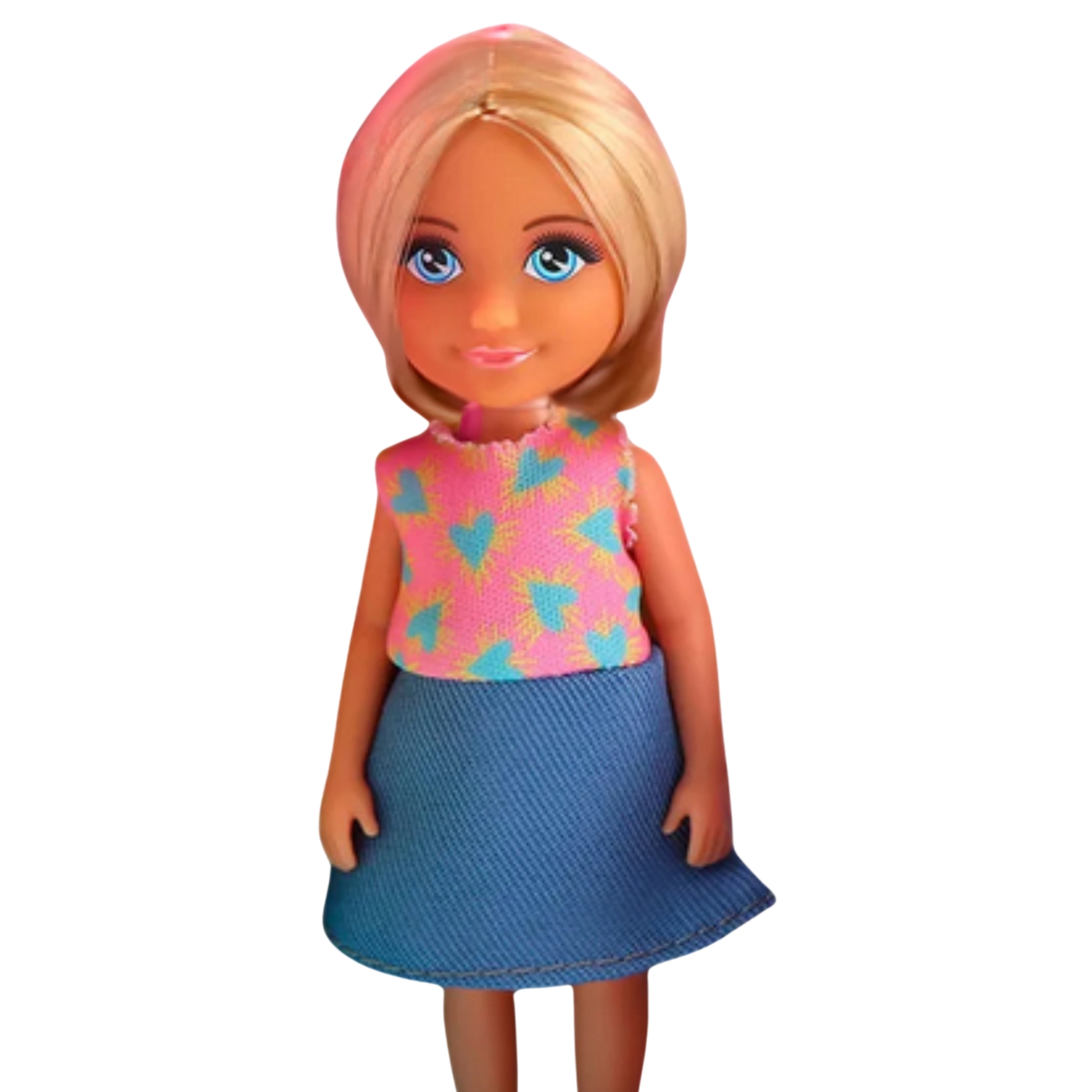 - Punčka z blond lasmi v krilu in topu s srčki.