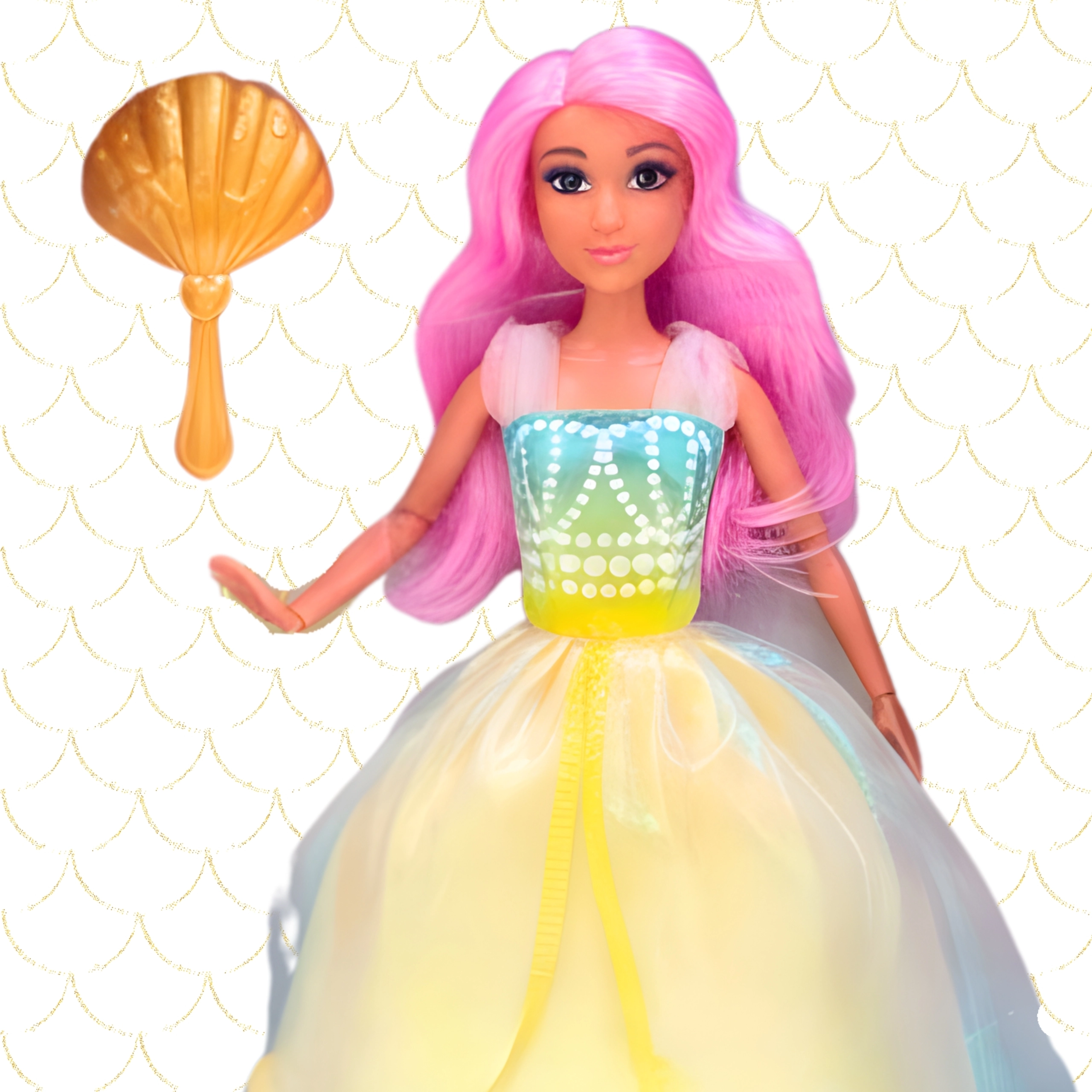 Del kompleta sta zlati glavniček v obliki školjke in eleganten prstan, ki dopolnjujeta stil in spodbujata igro vlog. Punčka je odlična za otroke od 3 let in pomaga razvijati fino motoriko, domišljijo ter pripovedovanje zgodb.