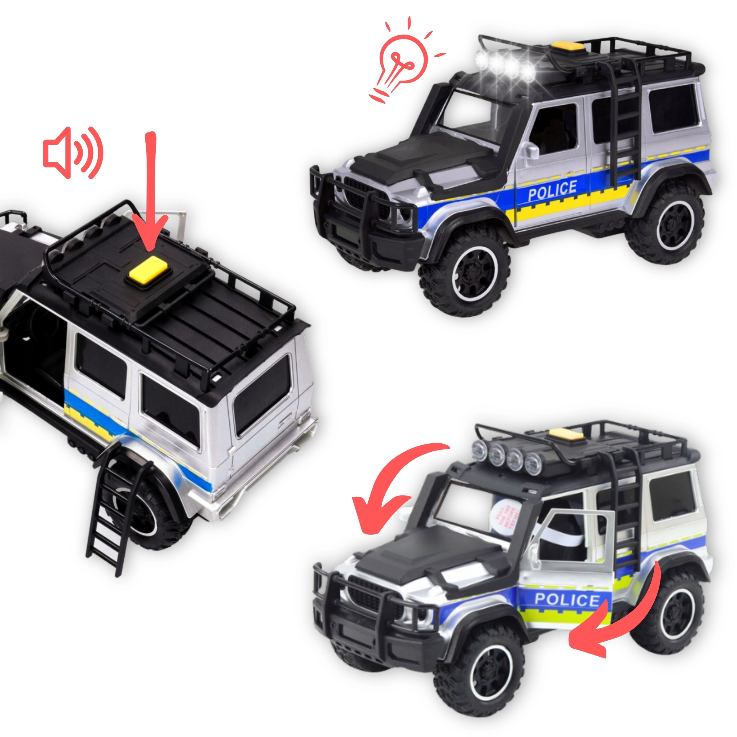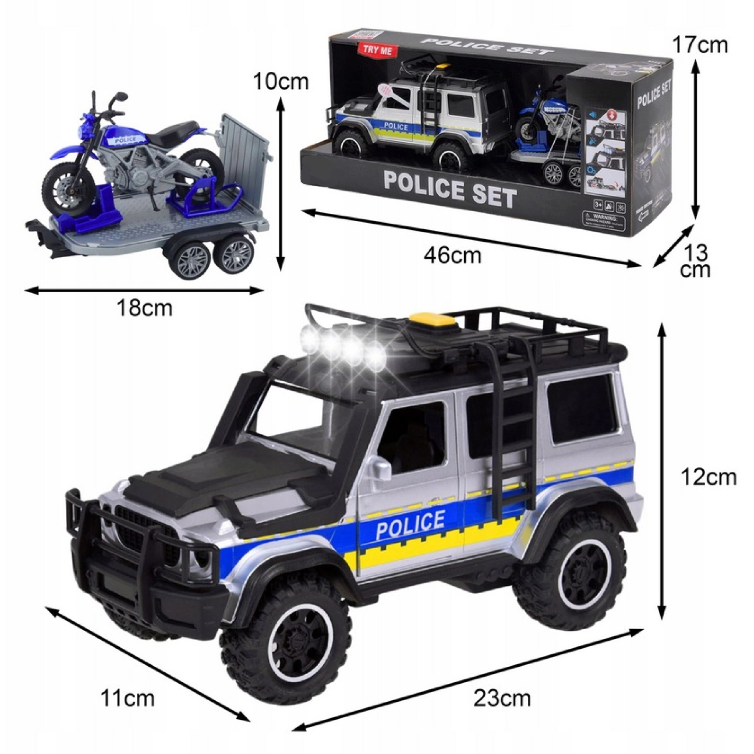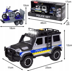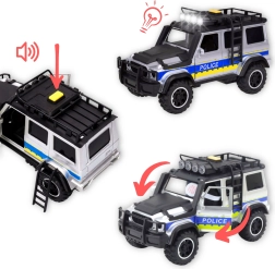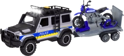 Policijski set WOOPIE združuje odporno izvedbo z bogatimi funkcijami, ki spodbujajo otroško domišljijo. Veliko terensko vozilo s svetlobnimi in zvočnimi učinki verno posnema akcijo na terenu, medtem ko prikolica z motociklom omogoča hitre posredovanja tudi na težko dostopnih mestih. Odpirajoča se vrata in premični motocikel povečujejo interaktivnost in realističnost igre.