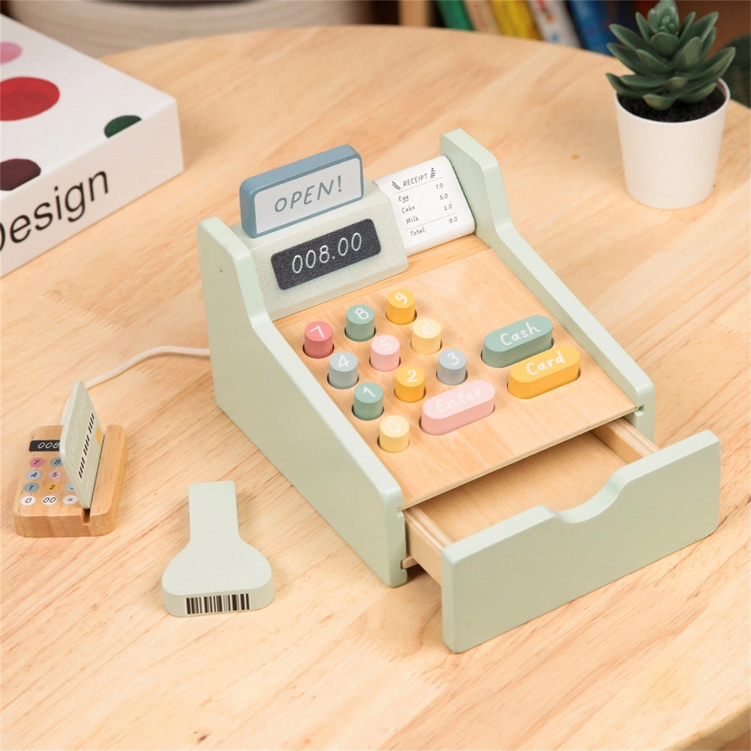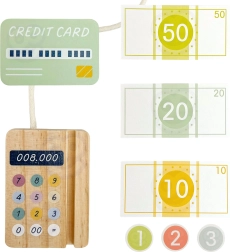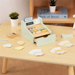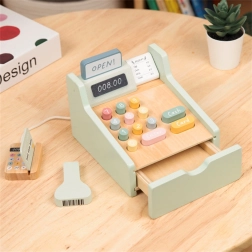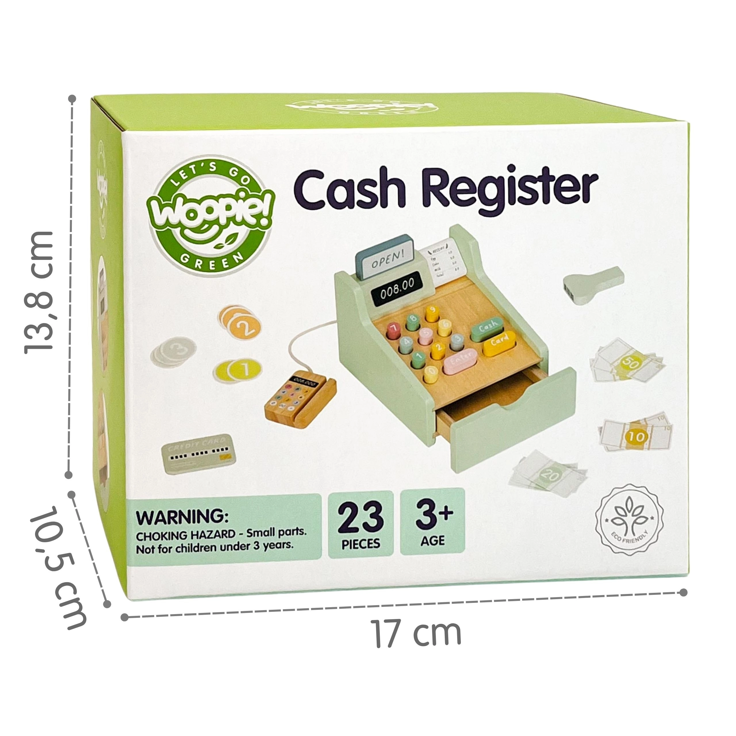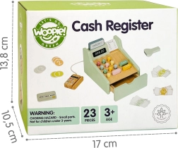 Lesena blagajna WOOPIE GREEN je idealna igrača za otroke od 3. leta, ki imajo radi igro trgovine, kavarne ali restavracije. Zahvaljujoč funkcionalnim elementom, kot so izvlečni predal za denar, skener črtnih kod in čitalnik plačilnih kartic, se otroci na naraven in zabaven način naučijo osnov plačevanja in upravljanja z denarjem.