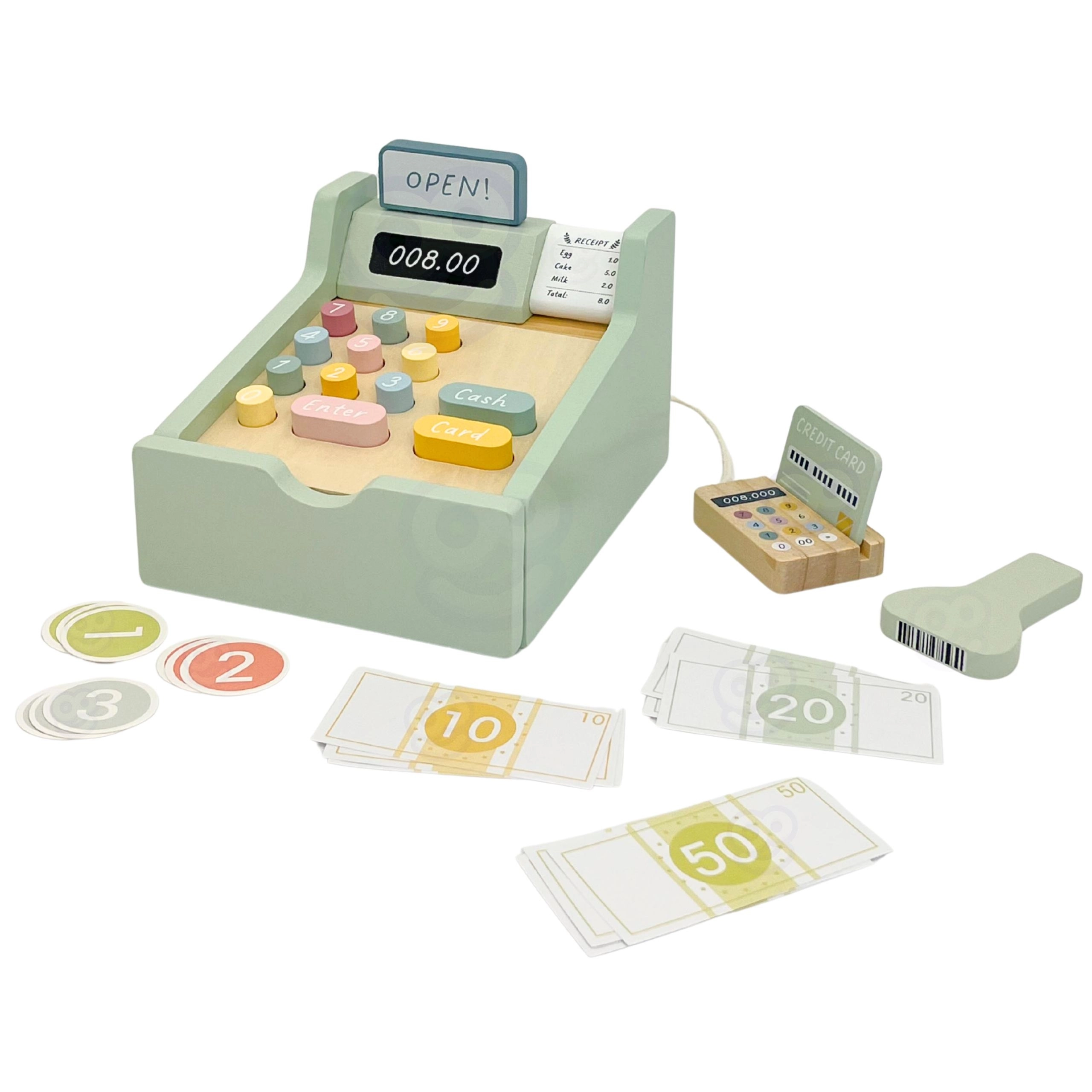 Otroci bodo vzljubili odpiranje blagajniškega predala, razvrščanje kovancev in pritiskanje preglednih gumbov – odličen trening fine motorike in koordinacije.