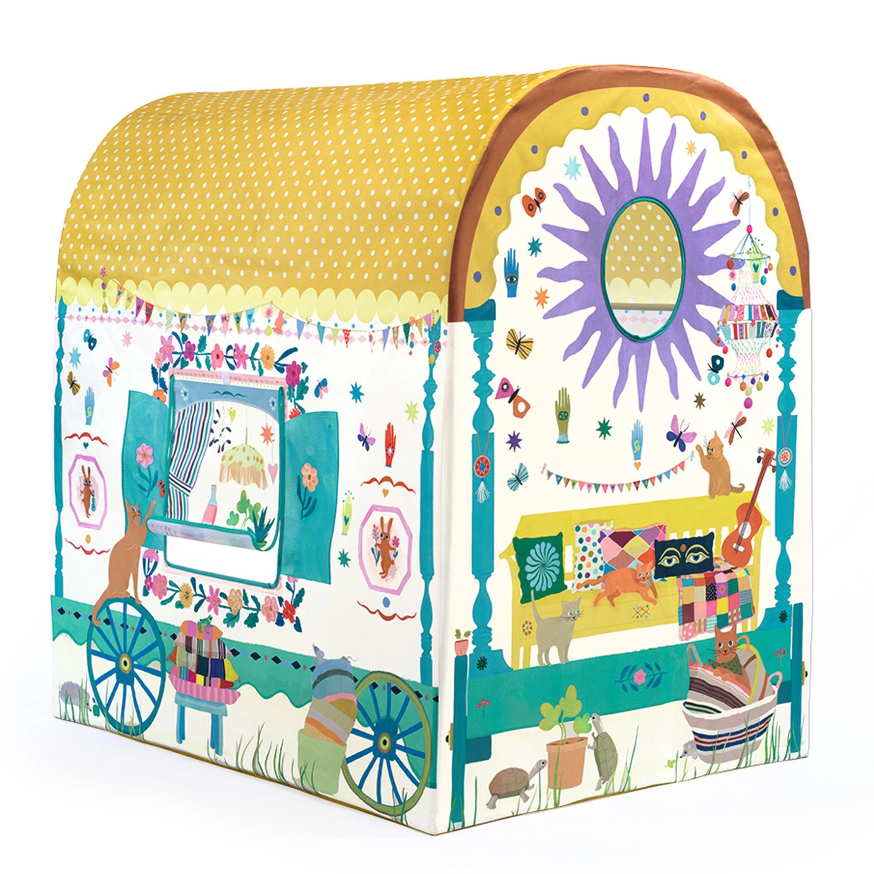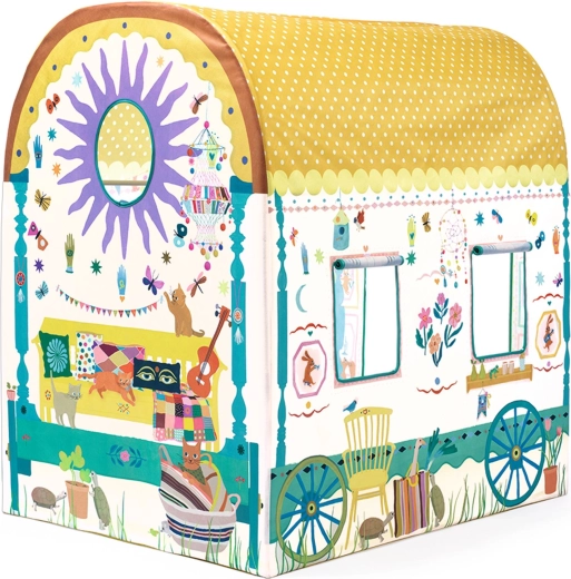 Ta prostoren igralni šotor DJECO v slogu karavane otrokom ponuja njihov lastni skrivni kotiček za branje, počitek in domiselne igre. Zaradi zaobljene strehe s pikami, tiskanih oken in veselih dekoracij deluje kot majhna hišica, ki lepo dopolni vsako otroško sobo.