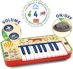 Ta kakovosten otroški sintetizator v lesenem ohišju bo razveselil male glasbenike in njihove starše. Zaradi vesele, ročno poslikane podobe in prijetne izdelave je odlična prva stopnička v svet glasbe. Igranje na instrument spodbuja slušno zaznavanje, koordinacijo oči in rok ter ustvarjalnost.