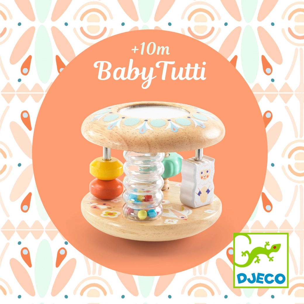 Baby Tutti je premišljena lesena igrača, ki jo je enostavno prijeti, prijetno ropoče in se po odložitvi kotali. Otroke pritegne barvni sip kroglic v prozornem tubusu, majhno ogledalce za prvo odkrivanje ter drsni obročki na paličkah. Igrača podpira koordinacijo roka–oko in motivira k plazenju ter obračanju.