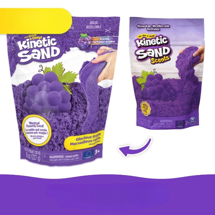 Kinetic Sand Scents prinaša čutno izkušnjo: mehak, oblikovalen pesek z prijetno aromo grozdja, ki ga bodo otroci vzljubili. Posebna sestava ohranja zrnca skupaj, zato se pesek manj raztresa in je delo z njim čisto ter udobno. Idealen za ustvarjalno igro doma – oblikujte črke, zgradbe, kalupe in domišljijske stvaritve.