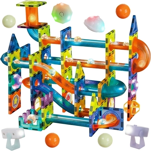 Magnetne kocke s kroglično stezo omogočajo otrokom gradnjo stolpov, mostov in spiralnih spustov ter opazovanje, kako kroglice švigajo skozi prosojne tunele. Trdna magnetna povezava zagotavlja stabilnost konstrukcij brez nepotrebnih padcev, medtem ko LED elementi vsako zgradbo spremenijo v svetlobni šov. Priložen je tudi barvni korak‑za‑korakom priročnik, ki olajša hiter začetek in navdihne za nove ideje.